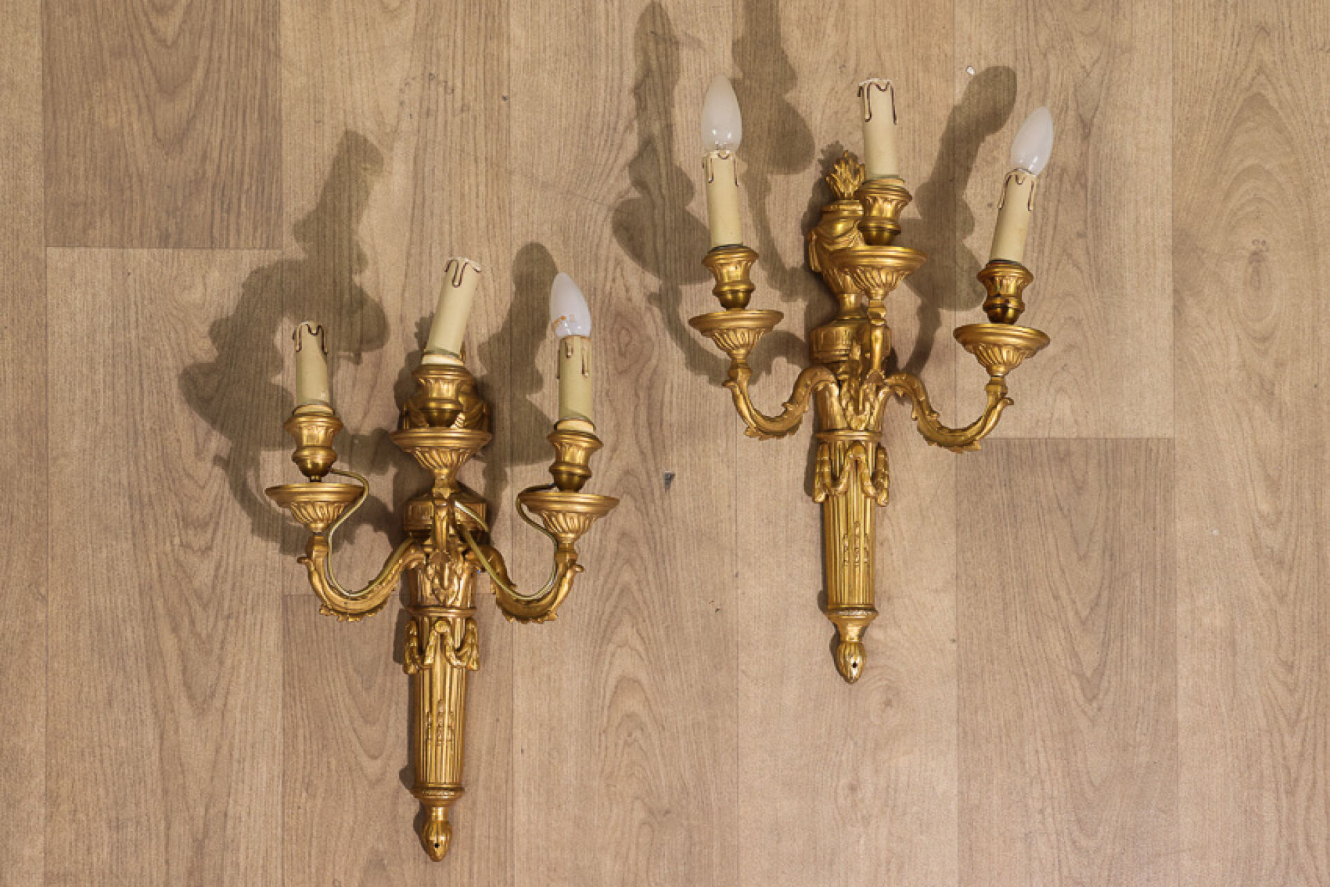 Paire d’appliques en bronze doré et ciselé à trois bras de lumières, la platine en...
