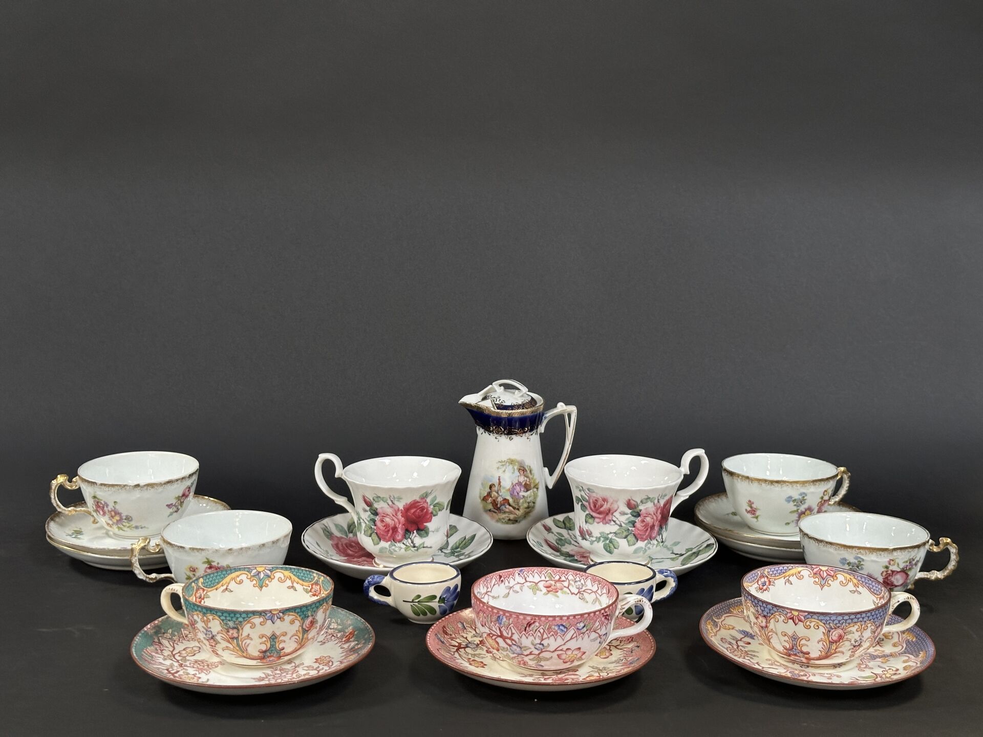 Ensemble en porcelaine et faïence dépareillé (fêles, accidents et restaurations, manques)...