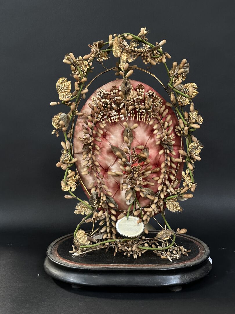Couronne de mariée reposant sur un coussin rose à la verticale, agrémentée d’un riche...