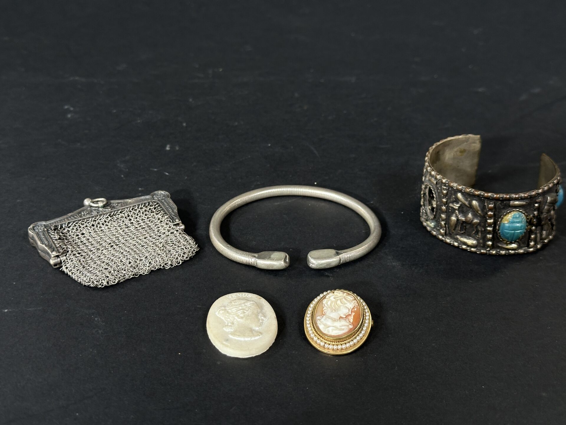 Réunion d’un camée dans un entourage perlé monture en métal doré, une pierre dure au...