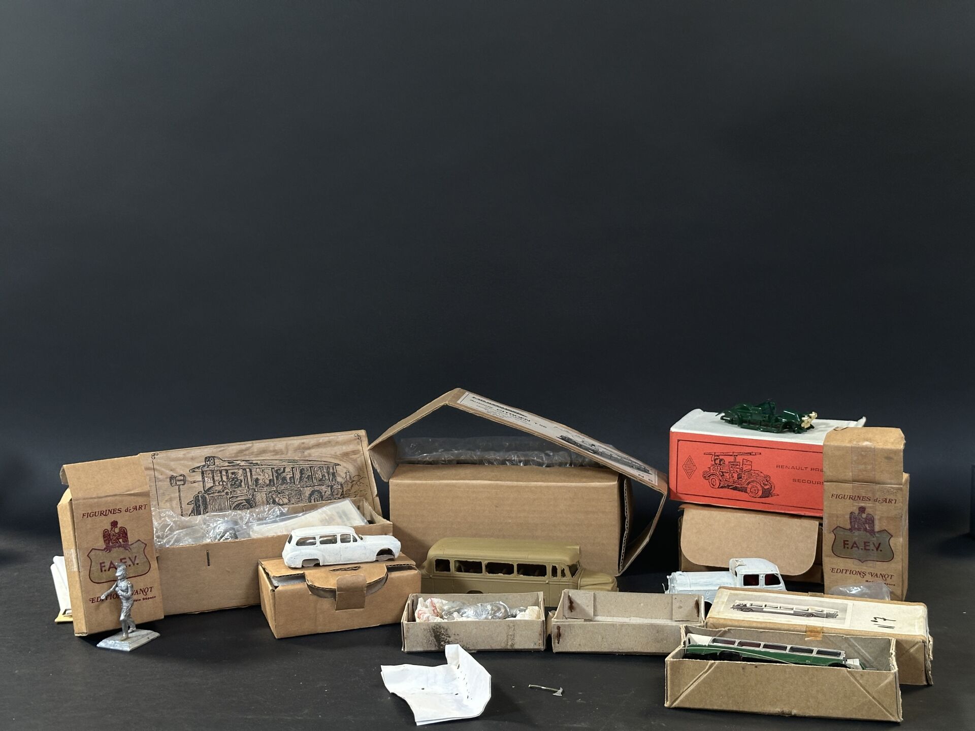 Réunion de neuf boîtes contenant des soldats miniatures, animaux et véhicules à monter.