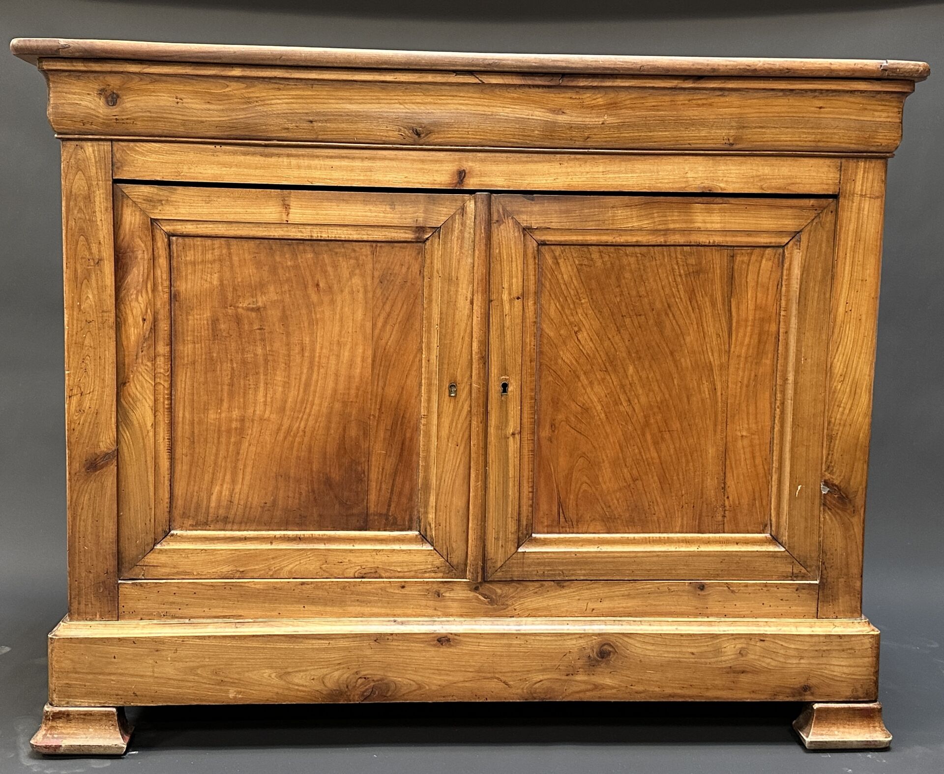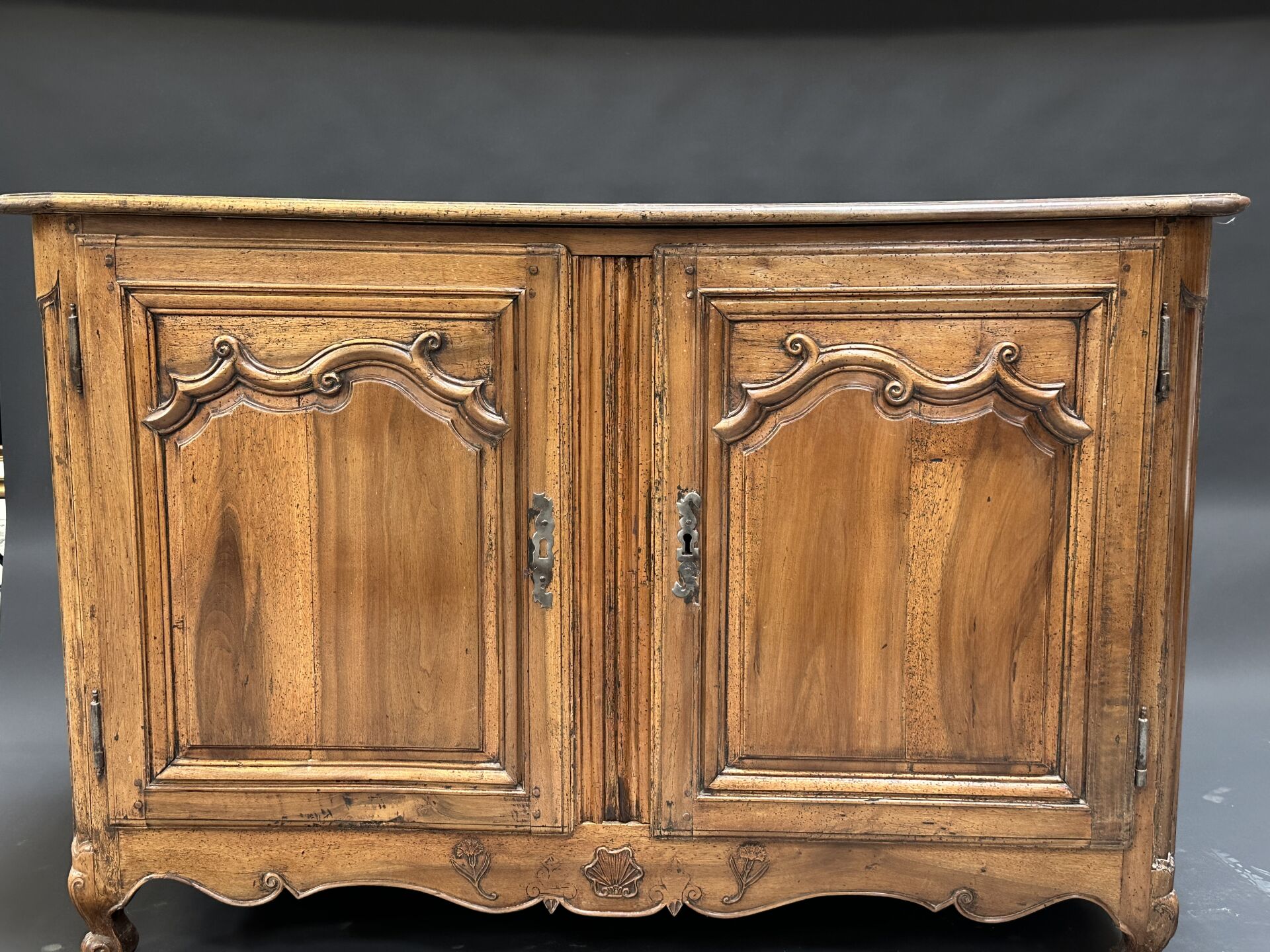 Buffet en bois mouluré ouvrant par deux vantaux, pieds à enroulements (travaux de vers;...