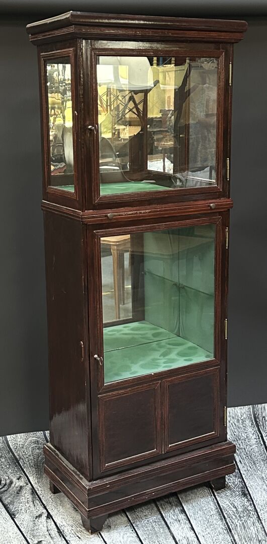 Vitrine en bois relaqué marron ouvrant par deux portes vitrées et une tirette, miroir en fond...