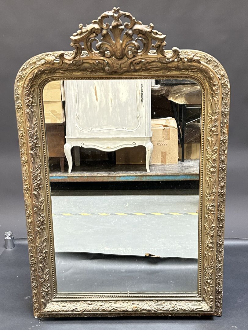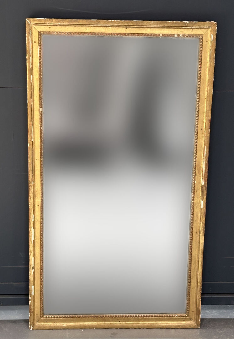 Miroir de cheminée en bois stuqué doré à décor d’une frise de perles (accidents et...