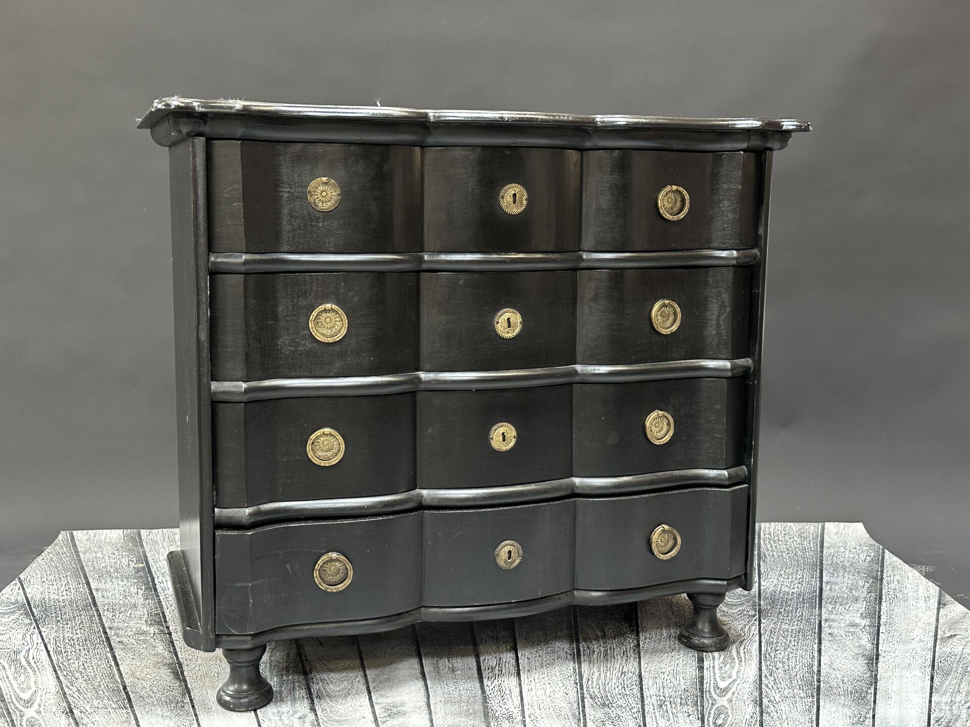 Commode arbalète en bois laqué noir ouvrant par quatre tiroirs, repose sur quatre pieds...