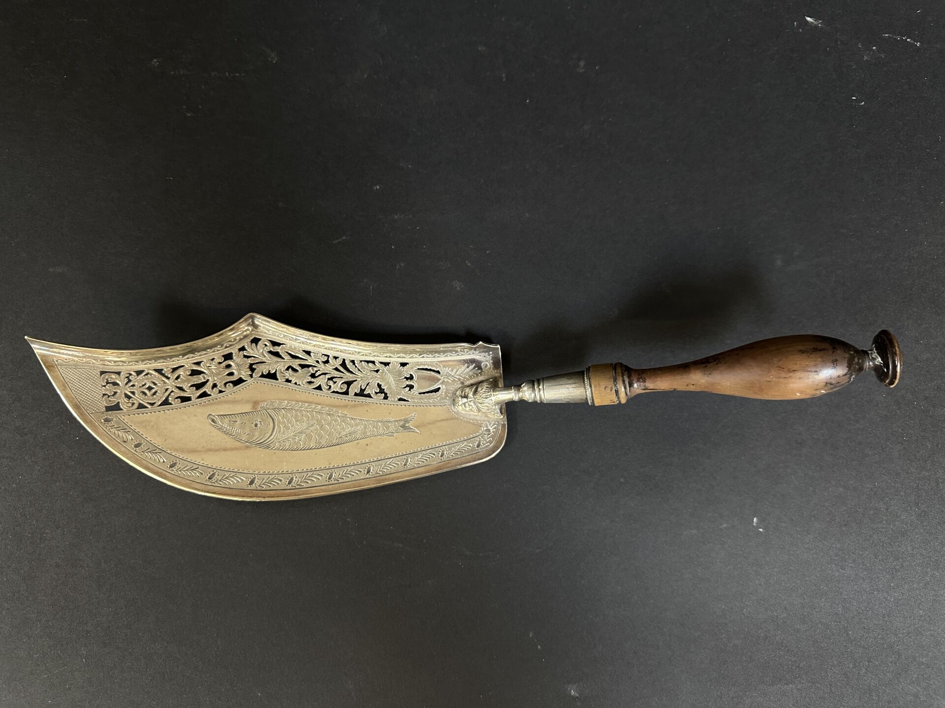 Pelle à poisson en argent à décor ajouré de feuilles et gravé d’un poisson, au revers...