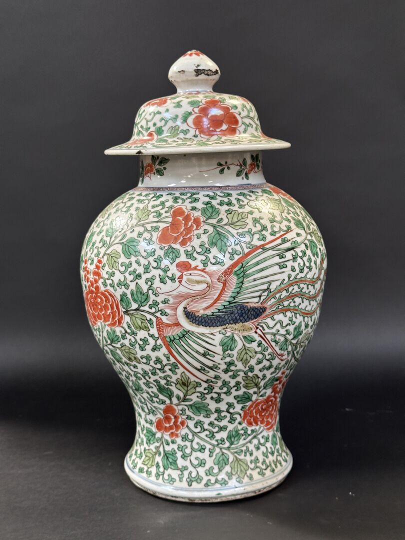 Vase couvert en porcelaine famille verte. De forme balustre, à décor de phénix en vol parmi...