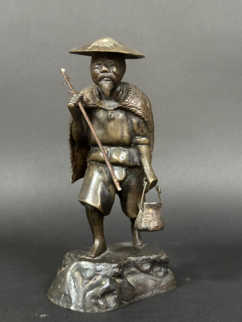Sujet en bronze à patine brune figurant un homme tenant une perche et un seau mobile (usures à...