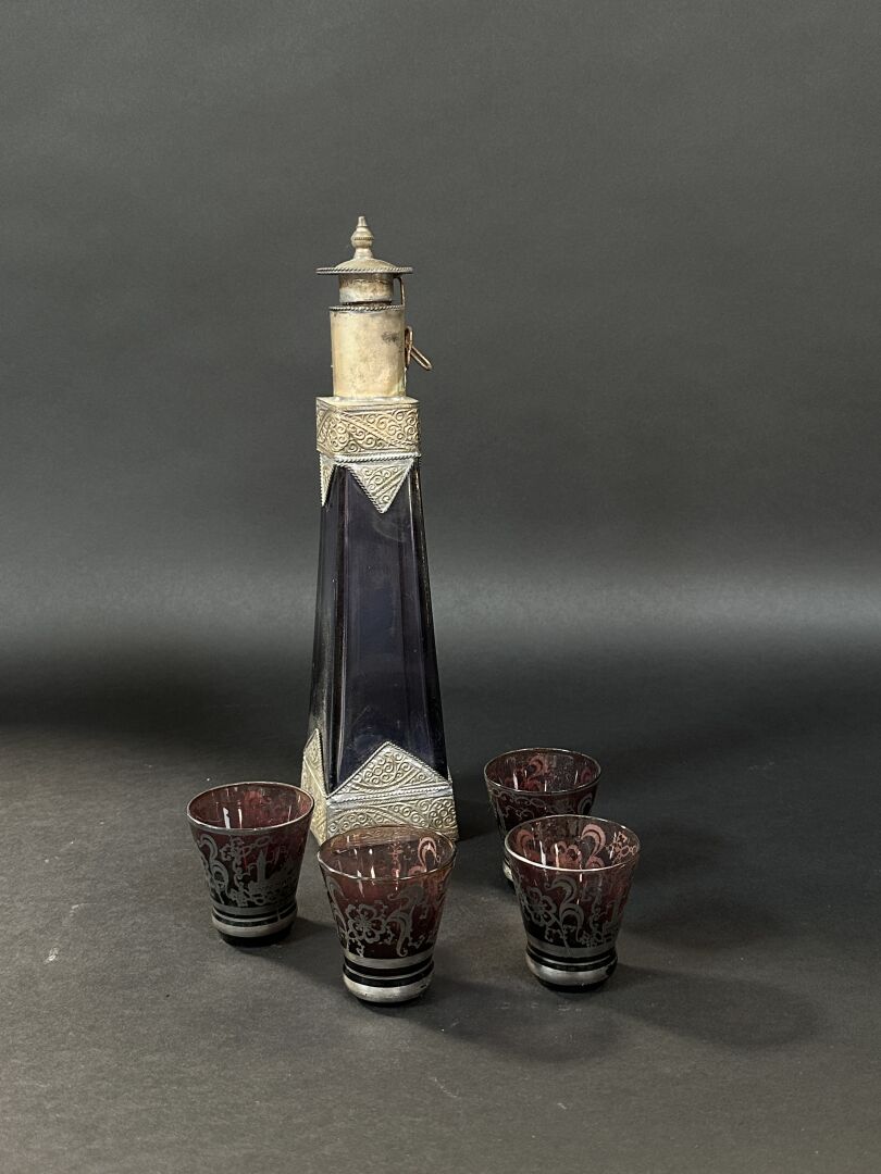 Réunion d’un flacon en verre bleuté et monture en laiton argenté orné de rinceaux, et...