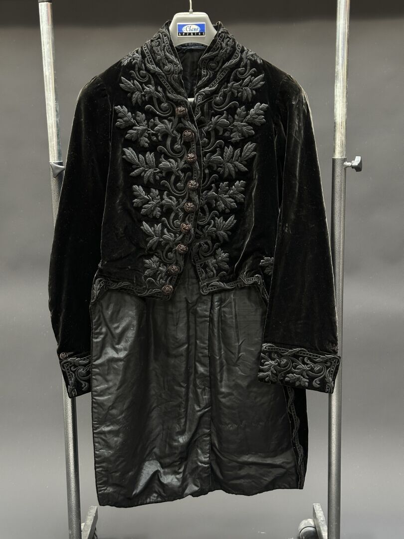 Veste d’habit pour un uniforme civil, velours noir brodé en noir de feuilles de chêne et...
