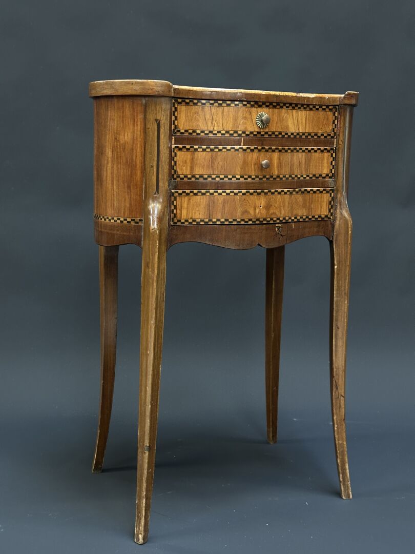 Table rognon en bois et bois de placage, marqueterie de damier en frise sur les tiroirs et...