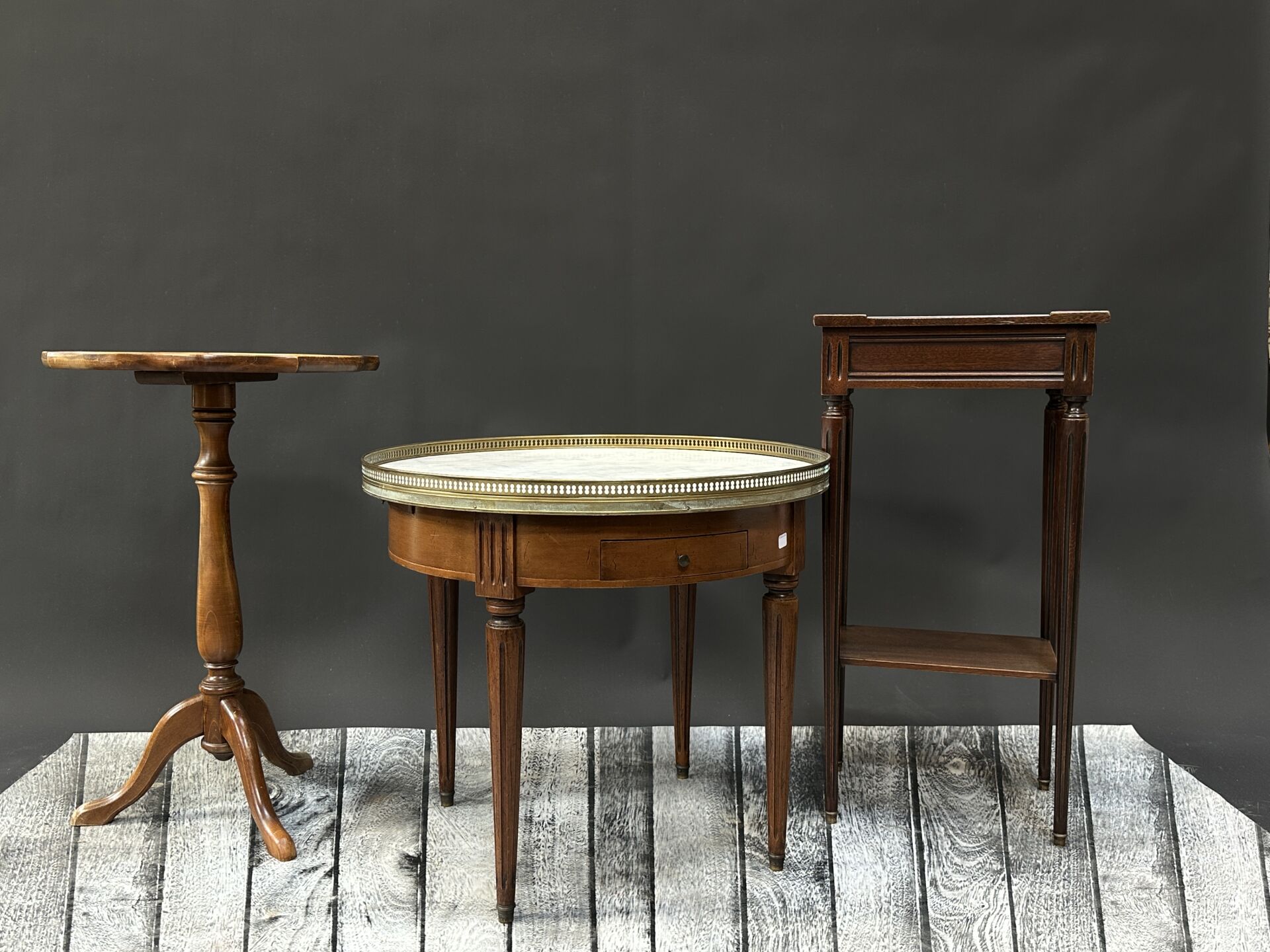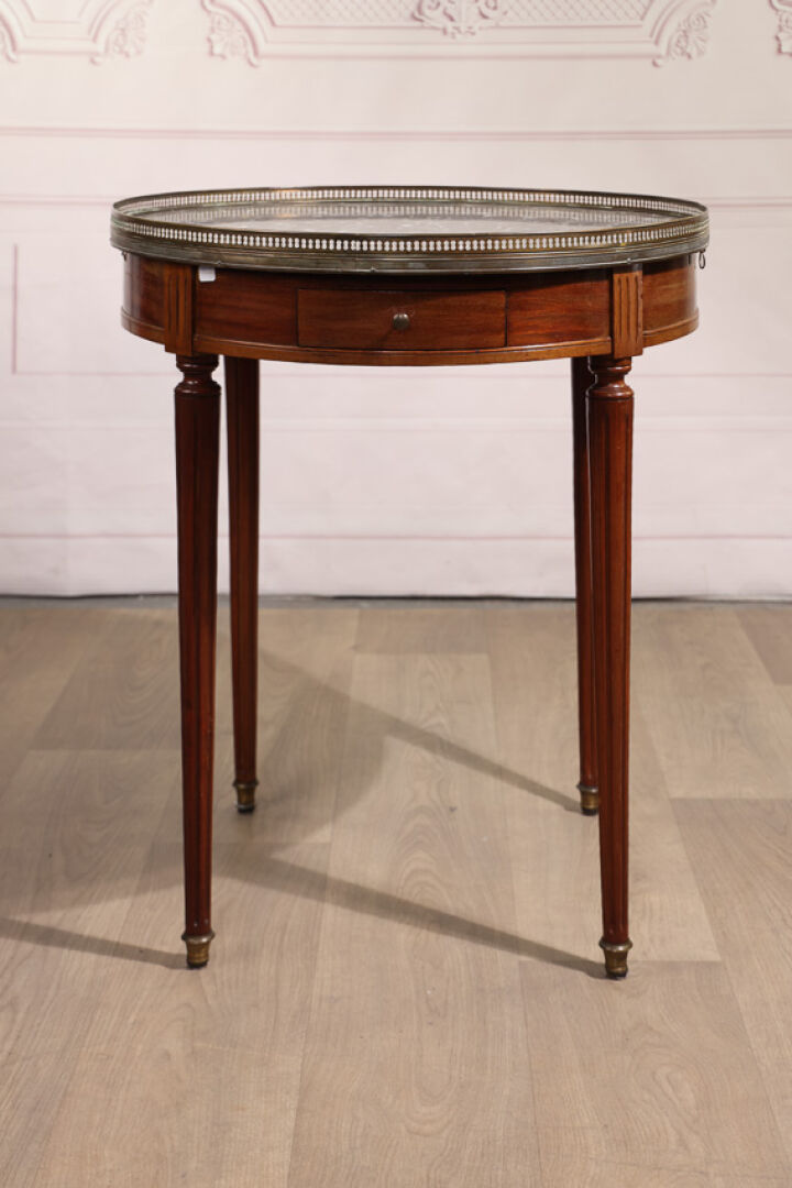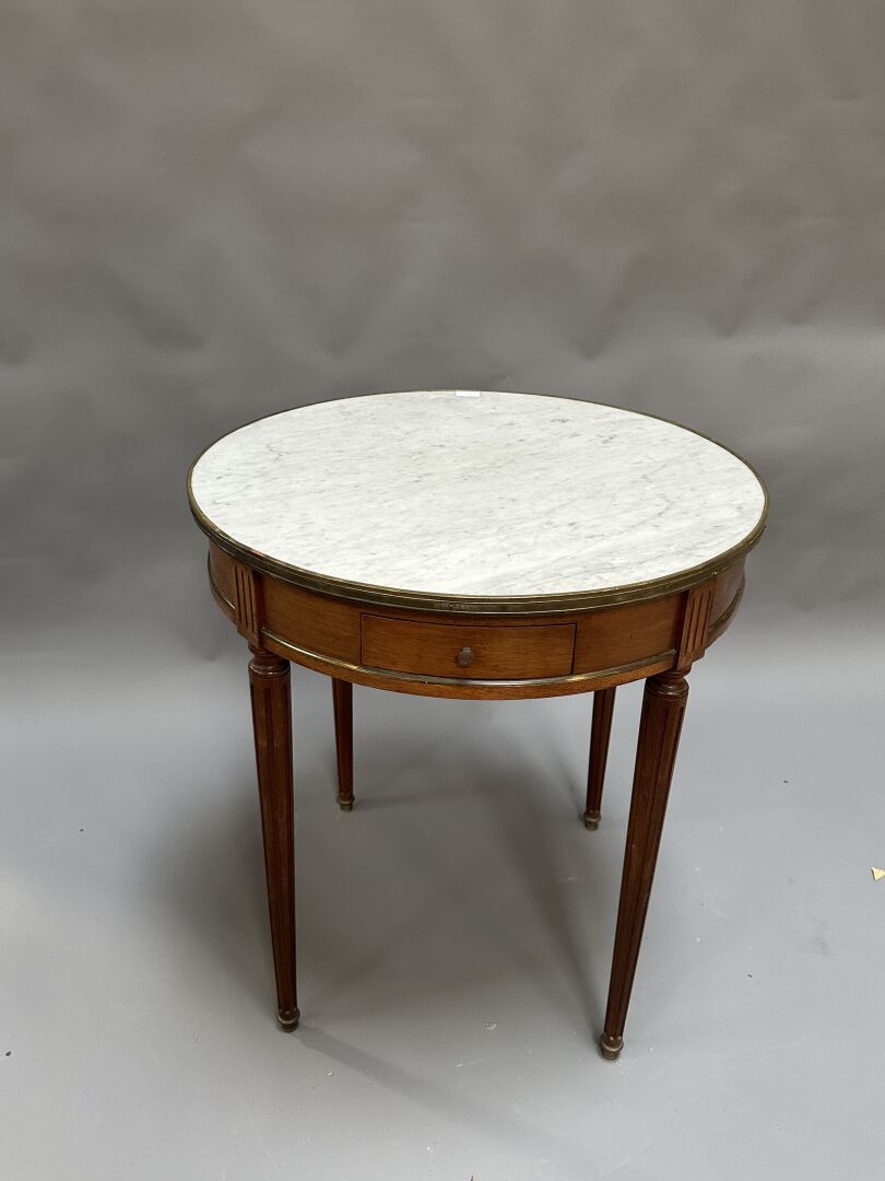 Table basse dite bouillotte, à plateau circulaire foncé d’un marbre blanc veiné gris,...