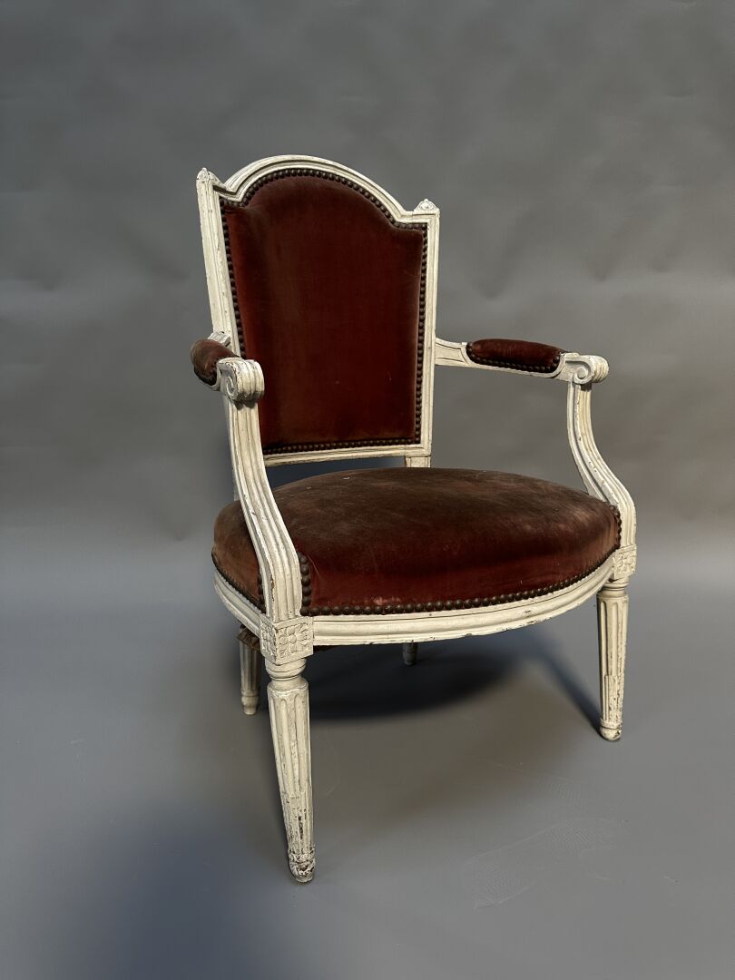 Fauteuil en bois laqué gris, le dossier à chapeau de gendarme, pieds fuselés, cannelés,...
