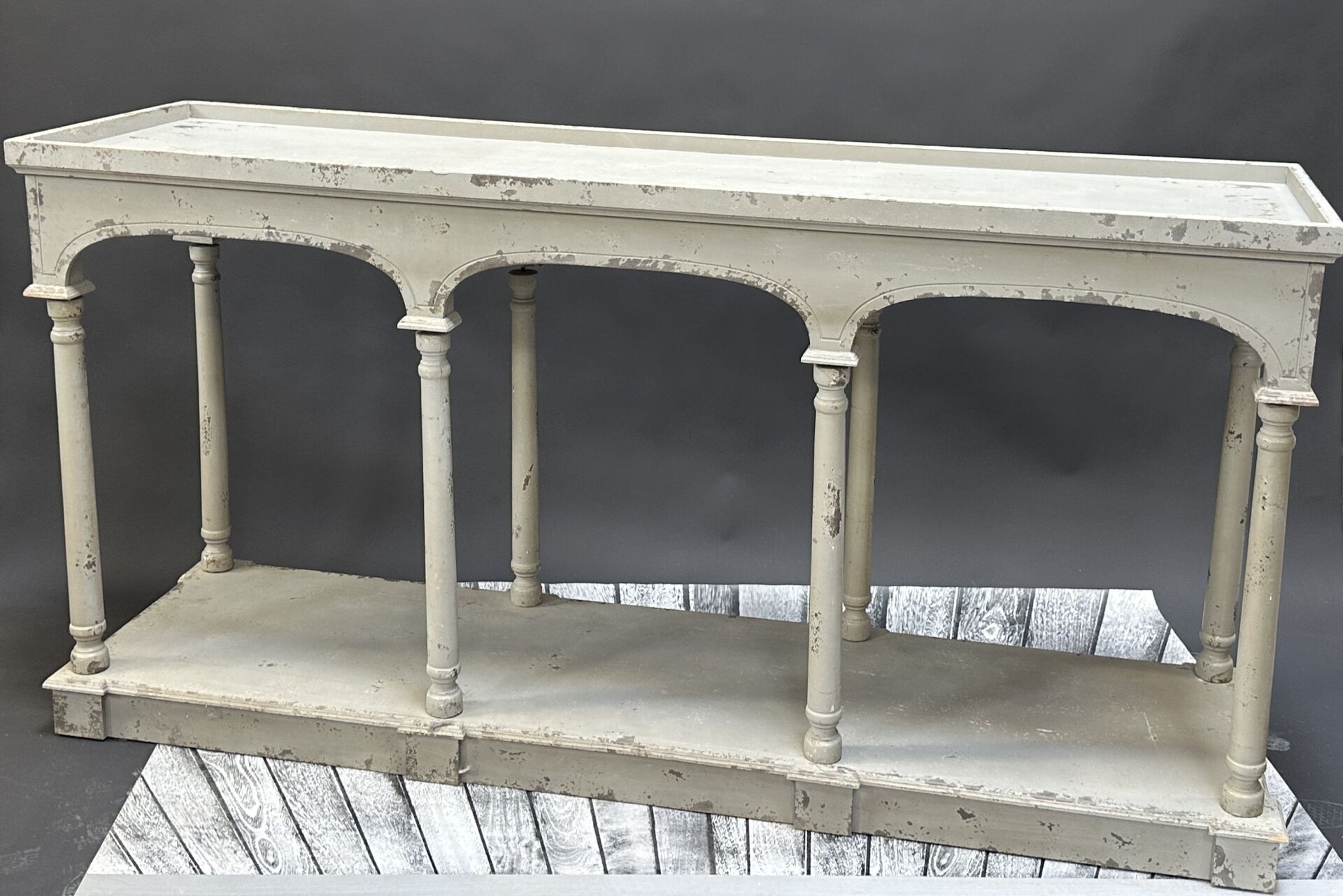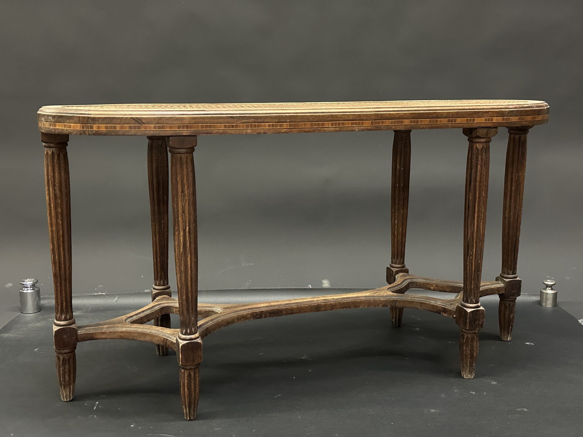 Table de drapier en bois laqué gris, huit pieds tournés reposant sur un socle en plinthe...