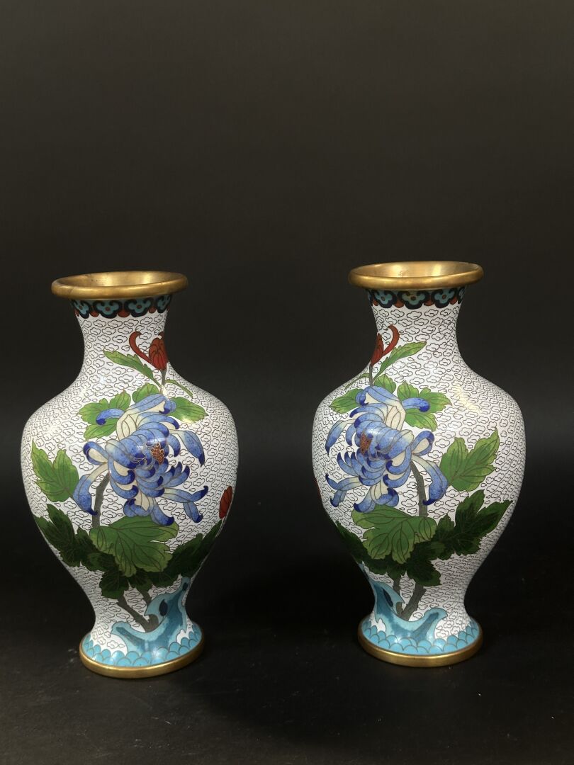 Paire de vases en laiton cloisonné à décor polychrome de fleurs et d’un oiseau branché...