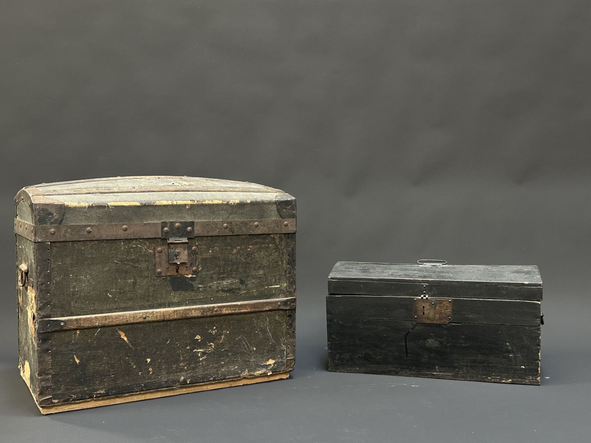 Réunion de deux malles en bois, l’une laquée noir, l’autre garni de tissu et cuir....