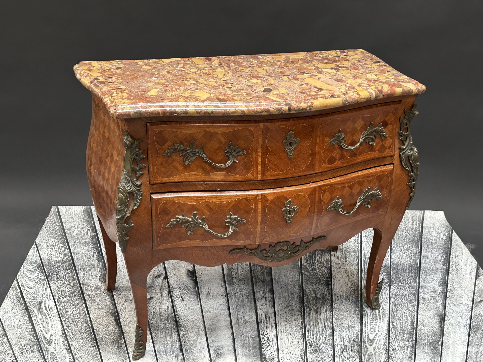 Commode sauteuse galbée en bois de placage à marqueterie de damiers. Elle ouvre par deux...