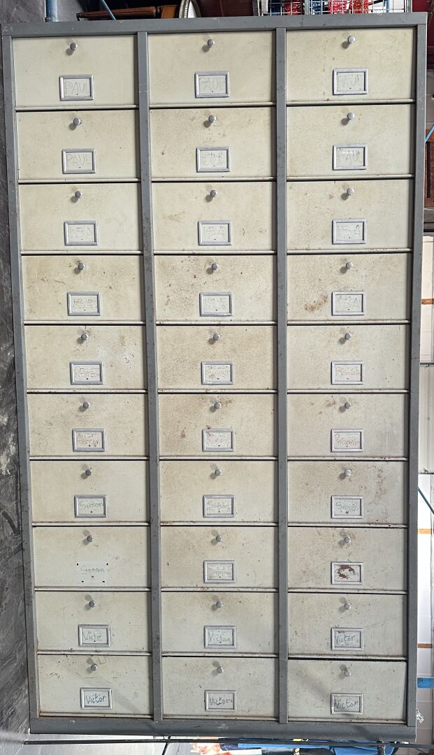 Meuble rangement industriel en métal gris et crème, à trente casiers ouvrant pas abattants...