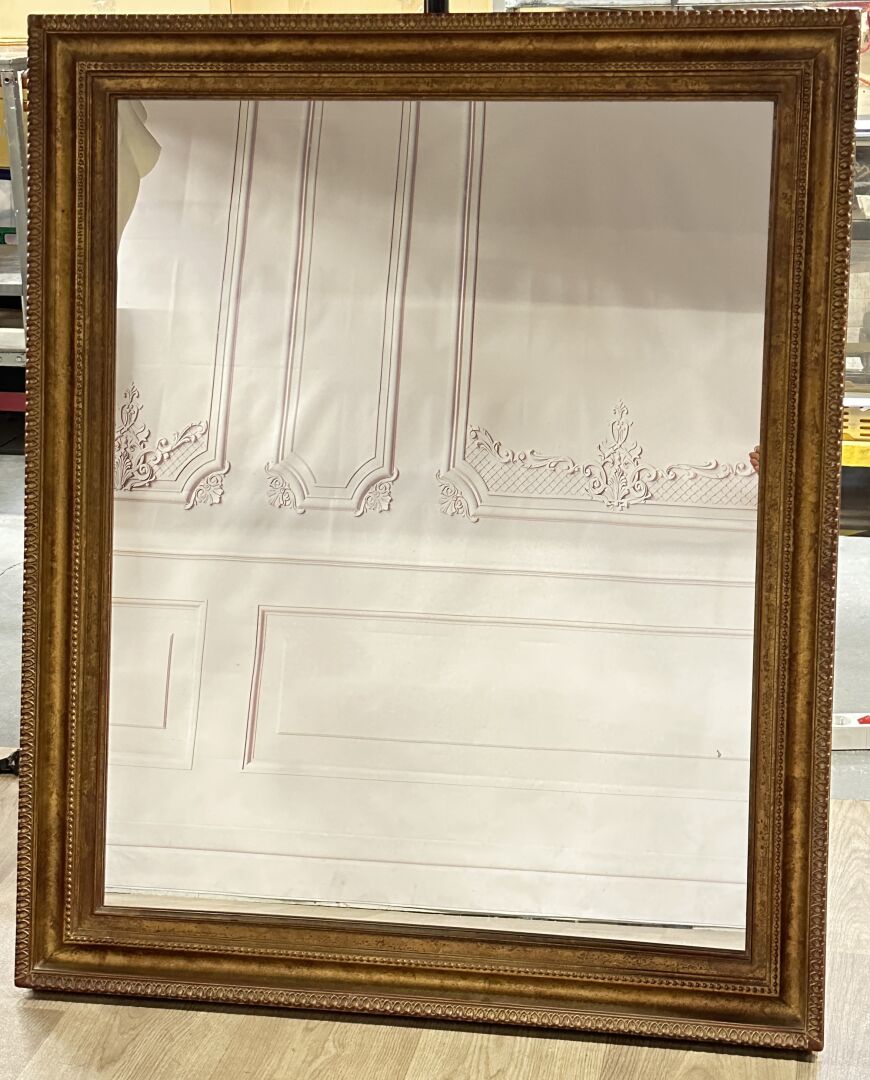Miroir rectangulaire en bois stuqué doré orné d’une frise de raies de coeurs et frise de...