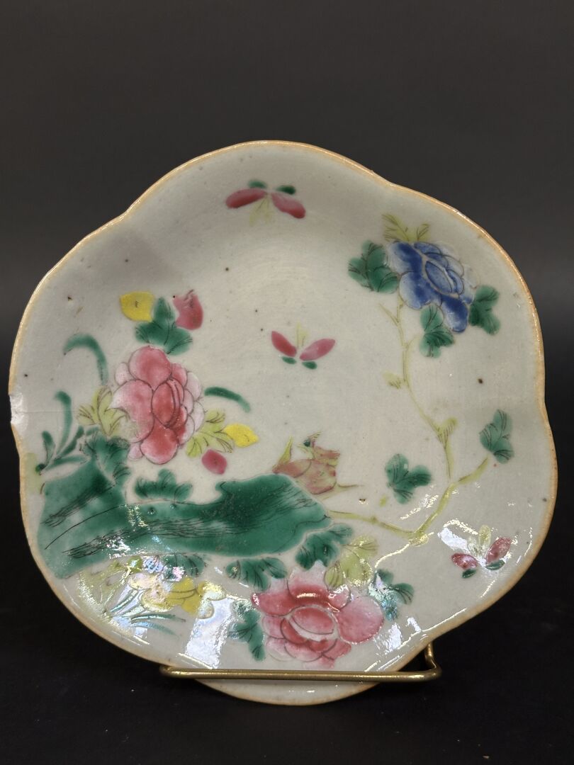 Coupe sur pied en porcelaine à décor émaillé polychrome d’un oiseau branché et...