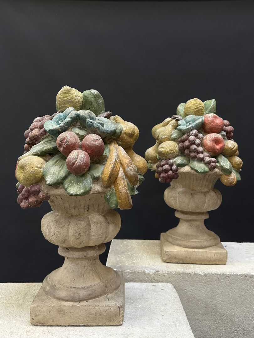 Paire d’ornements de jardin en pierre reconstituée polychrome comprenant des vases...