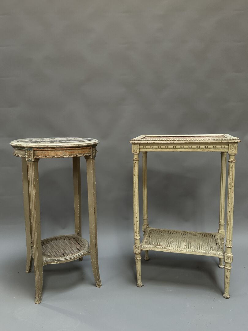 Réunion d’une sellette et d’une petite table rectangulaire en bois laqué gris,...