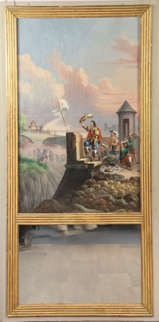Trumeau en bois laqué gris et bois doré, le miroir rectangulaire en partie basse est surmonté...