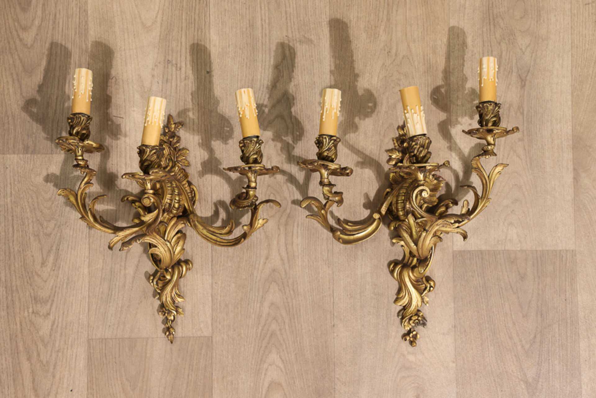 Paire d’appliques à trois lumières, en bronze doré et ciselé d’un riche décor de...