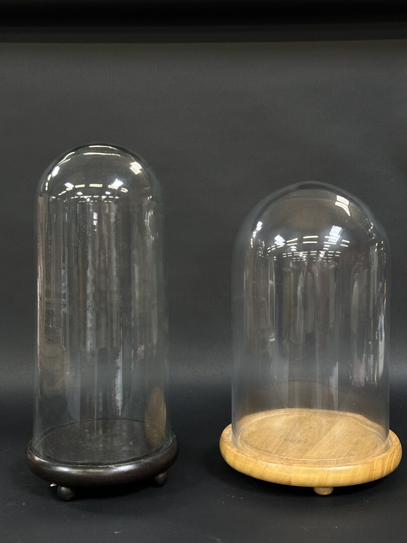 Réunion de deux globes en verre sur plateau de bois reposant sur trois petits pied boules,...
