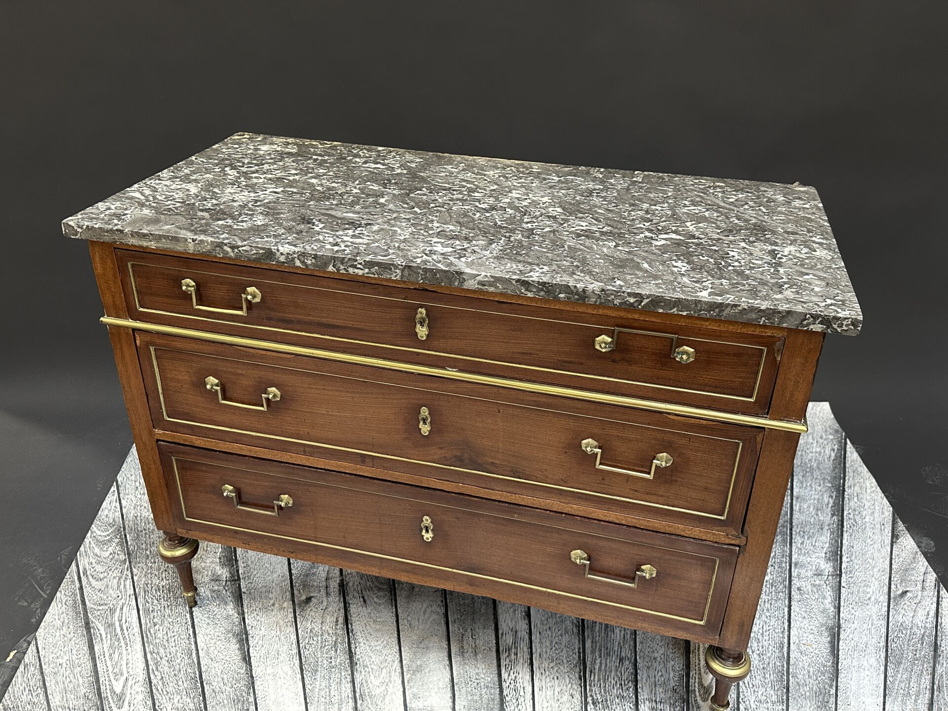 Commode rectangulaire en bois de placage ouvrant par trois tiroirs en façade, pieds toupies,...