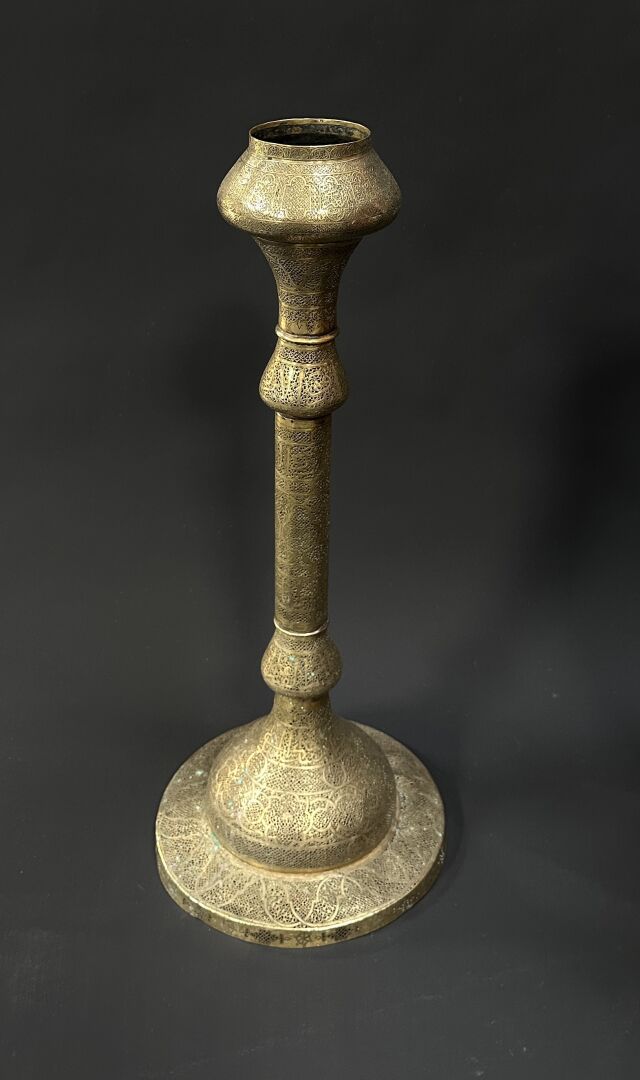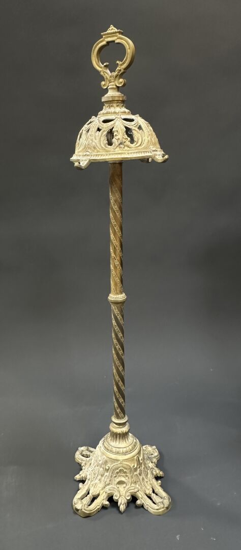Lampadaire en laiton doré à décor ciselé en partie ajouré de rinceaux et calligraphie...