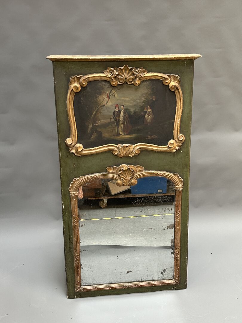 Trumeau en bois vert et encadrement en bois stuqué doré à décor de fleurs et coquilles. La...