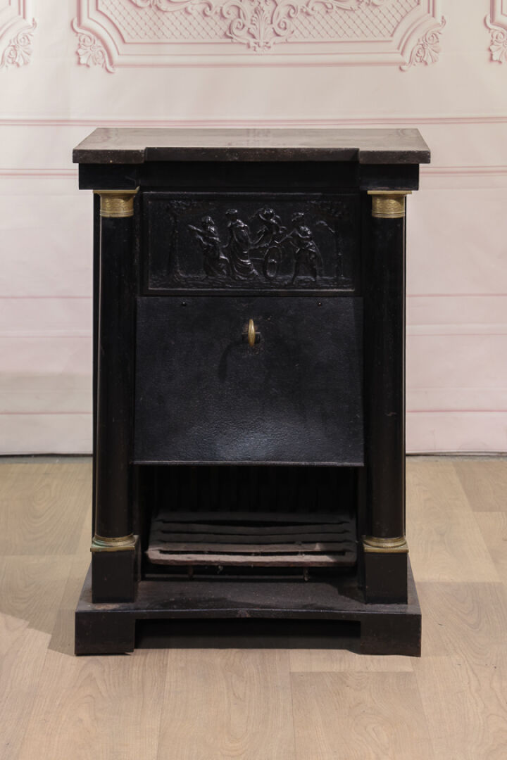 Poêle à bois en fonte à colonnes détachées baguées et orné d’une scène Antique....