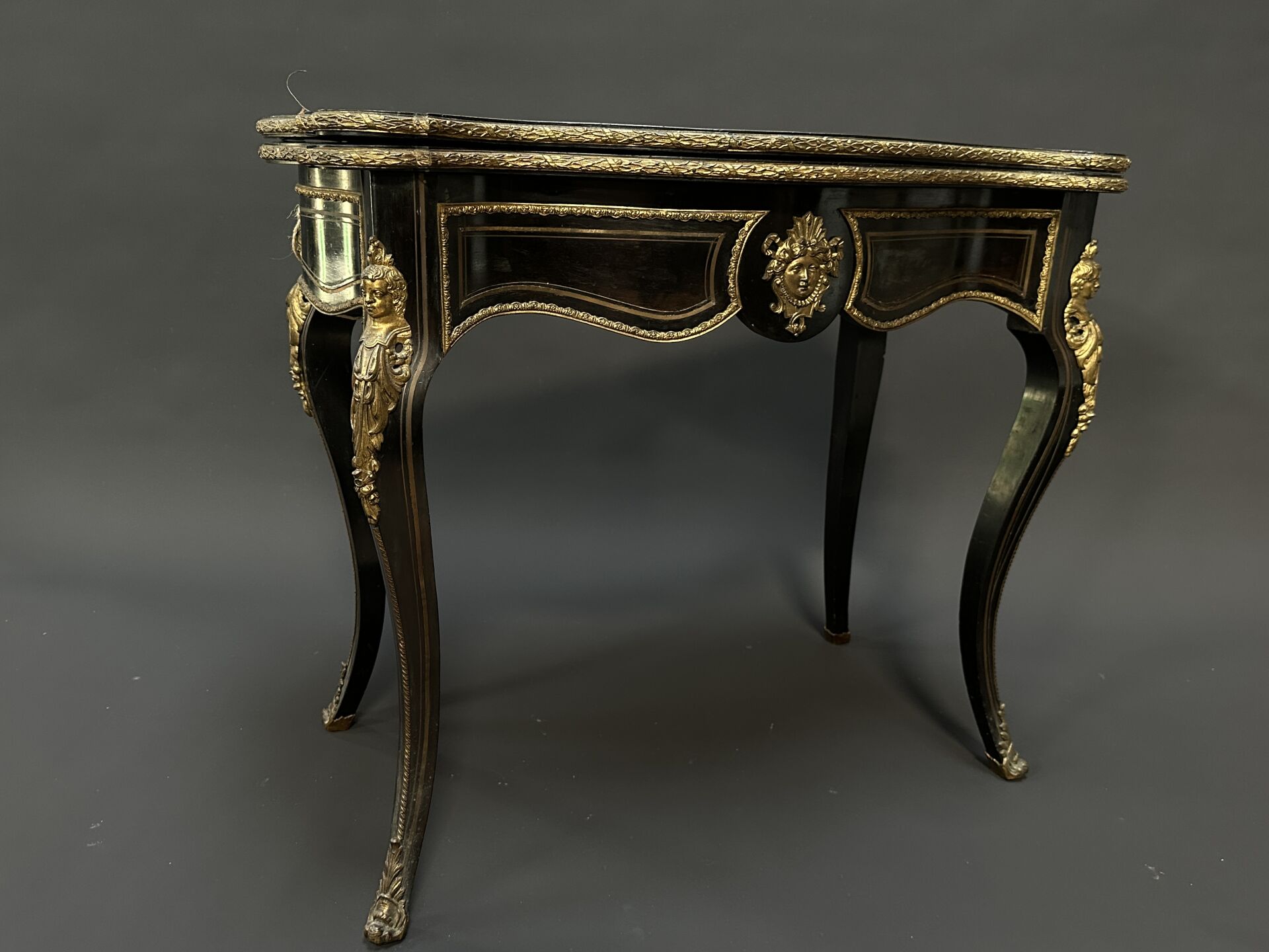 Table à jeux formant console en bois noirci, repose sur quatre pieds galbés. Décor en...
