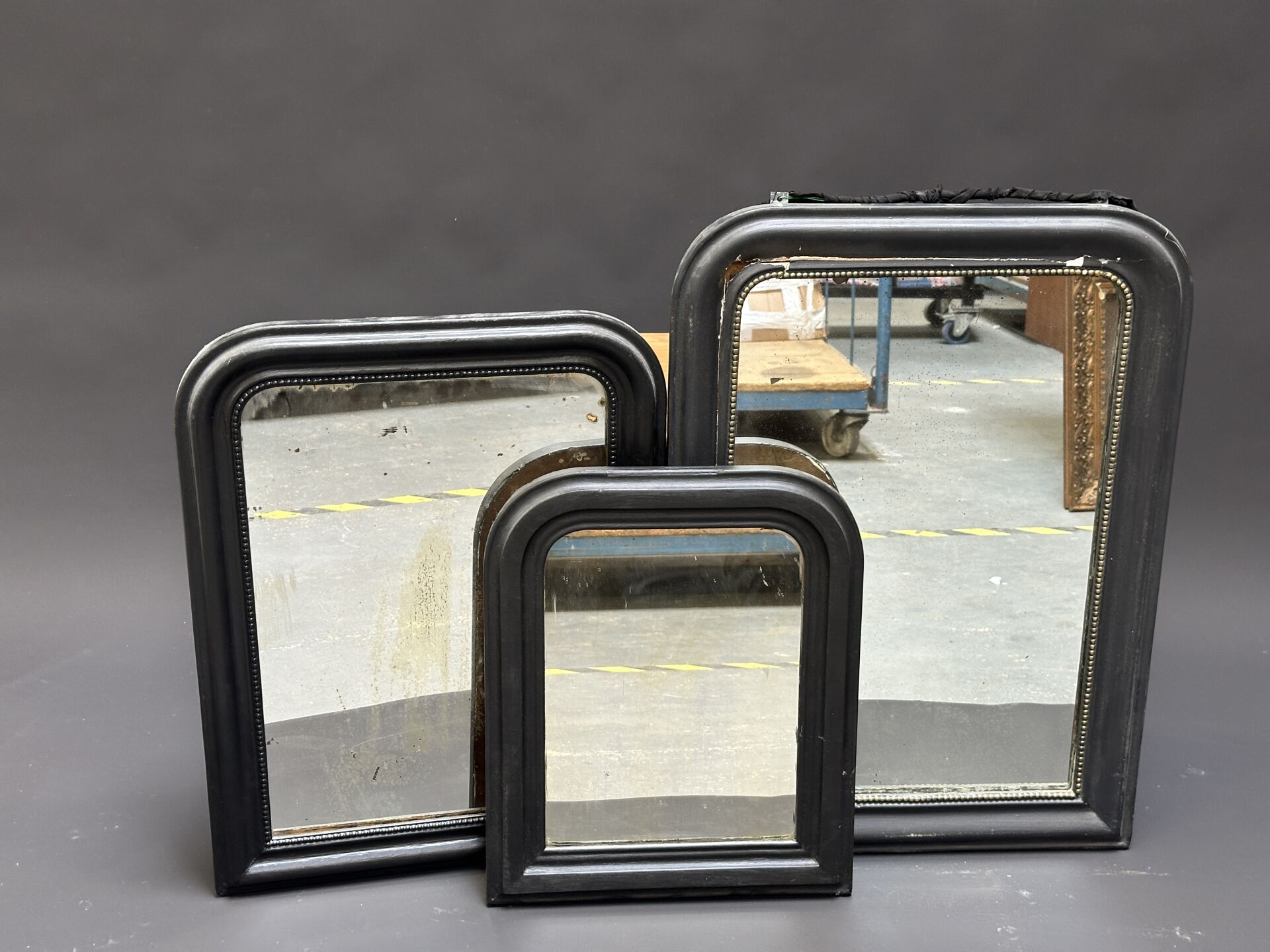 Réunion de trois miroirs en bois stuqué relaqué noir, deux à frise de perles (accidents et...