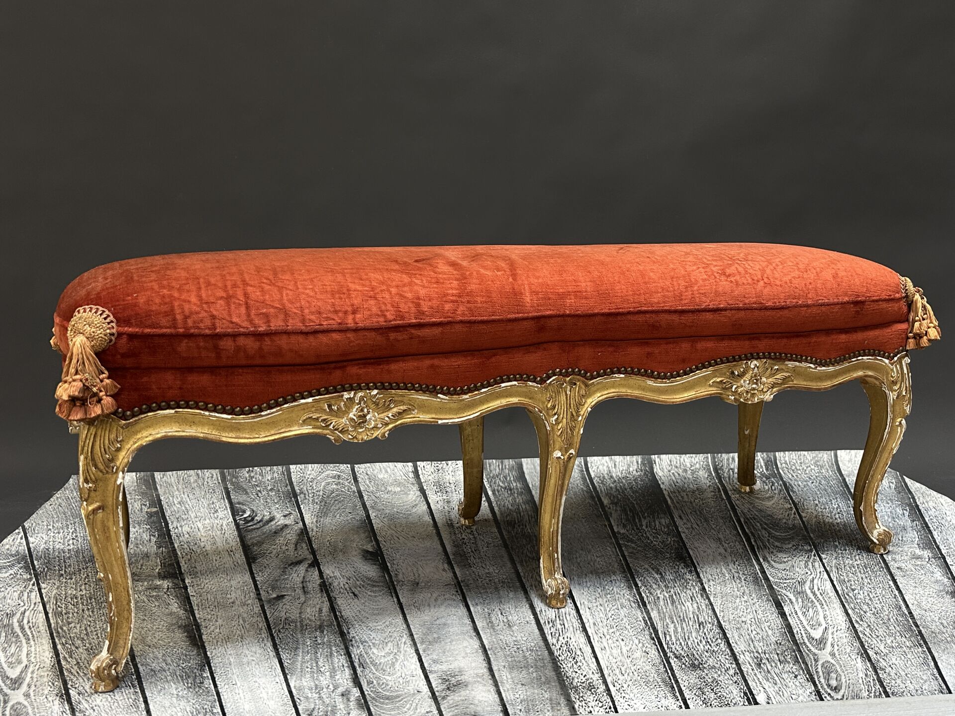 Banquette en bois stuqué doré, la ceinture mouvementée reposant sur six pieds galbés,...