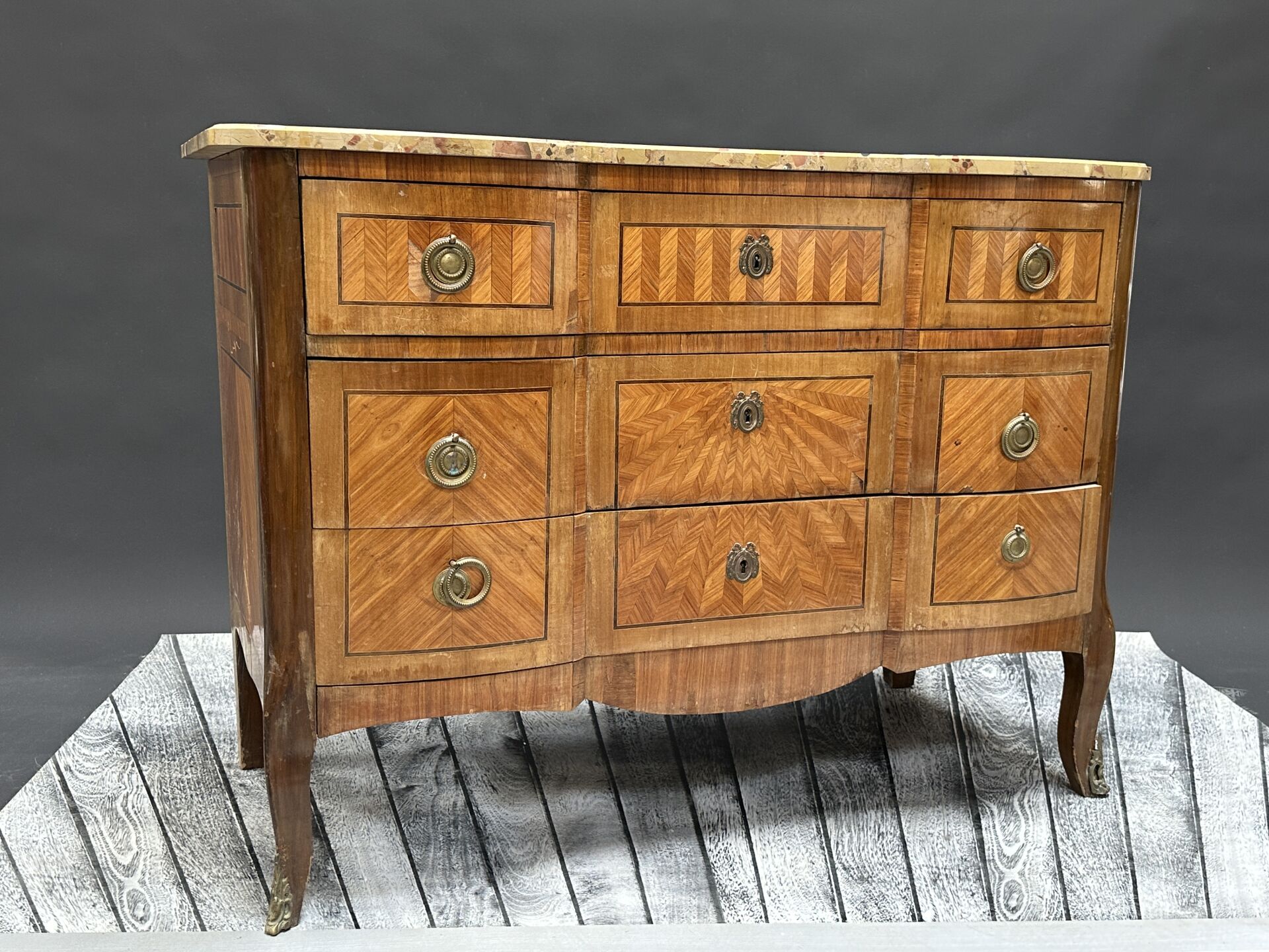 Commode arbalète en bois de placage à marqueterie d’épis et marqueterie rayonnante,...