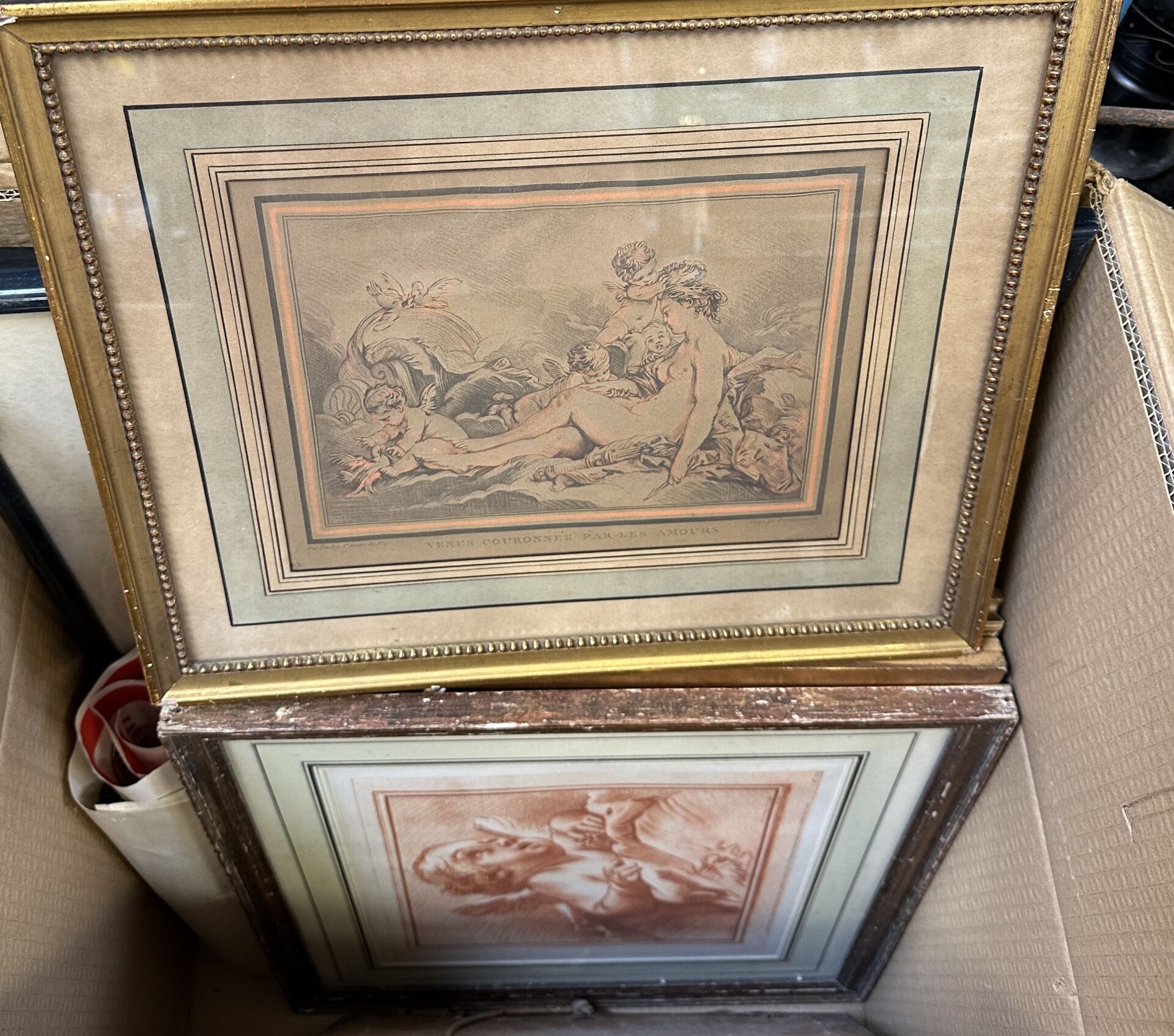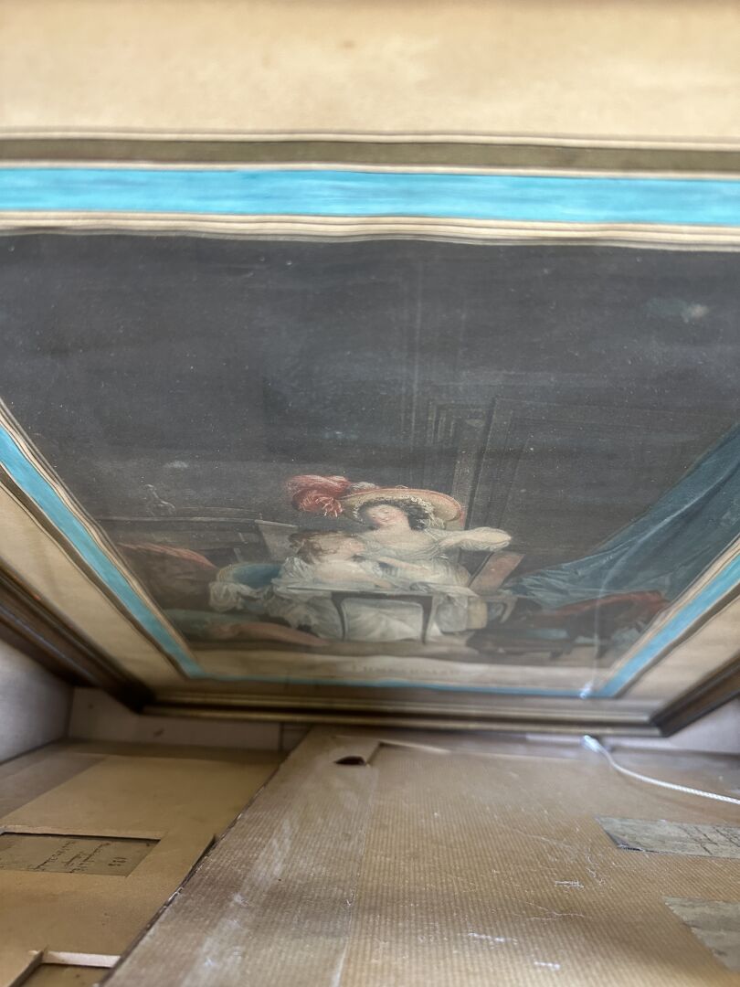 Réunion de douze pièces encadrées, gravures, dessins; auxquels on joint des éléments...