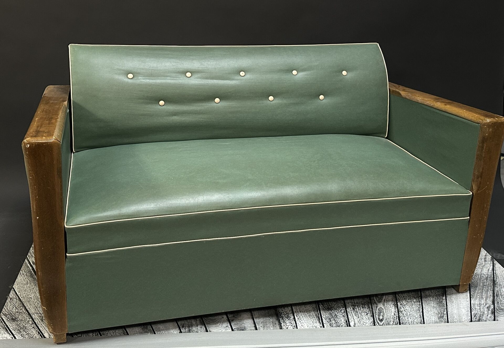 Canapé convertible scandinave en bois vernis et skaï vert (usures au vernis, un accident au...
