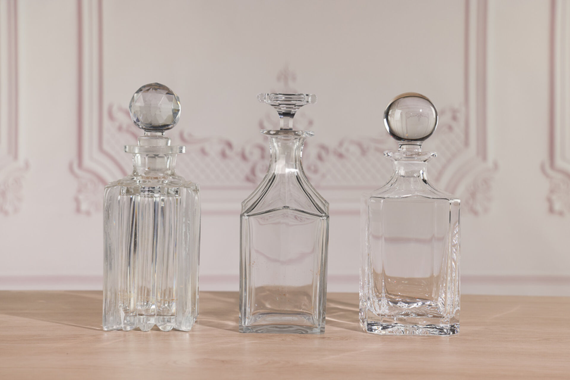Réunion de trois carafes à liqueur quadrangulaires en cristal, l’une à pans coupés, une...