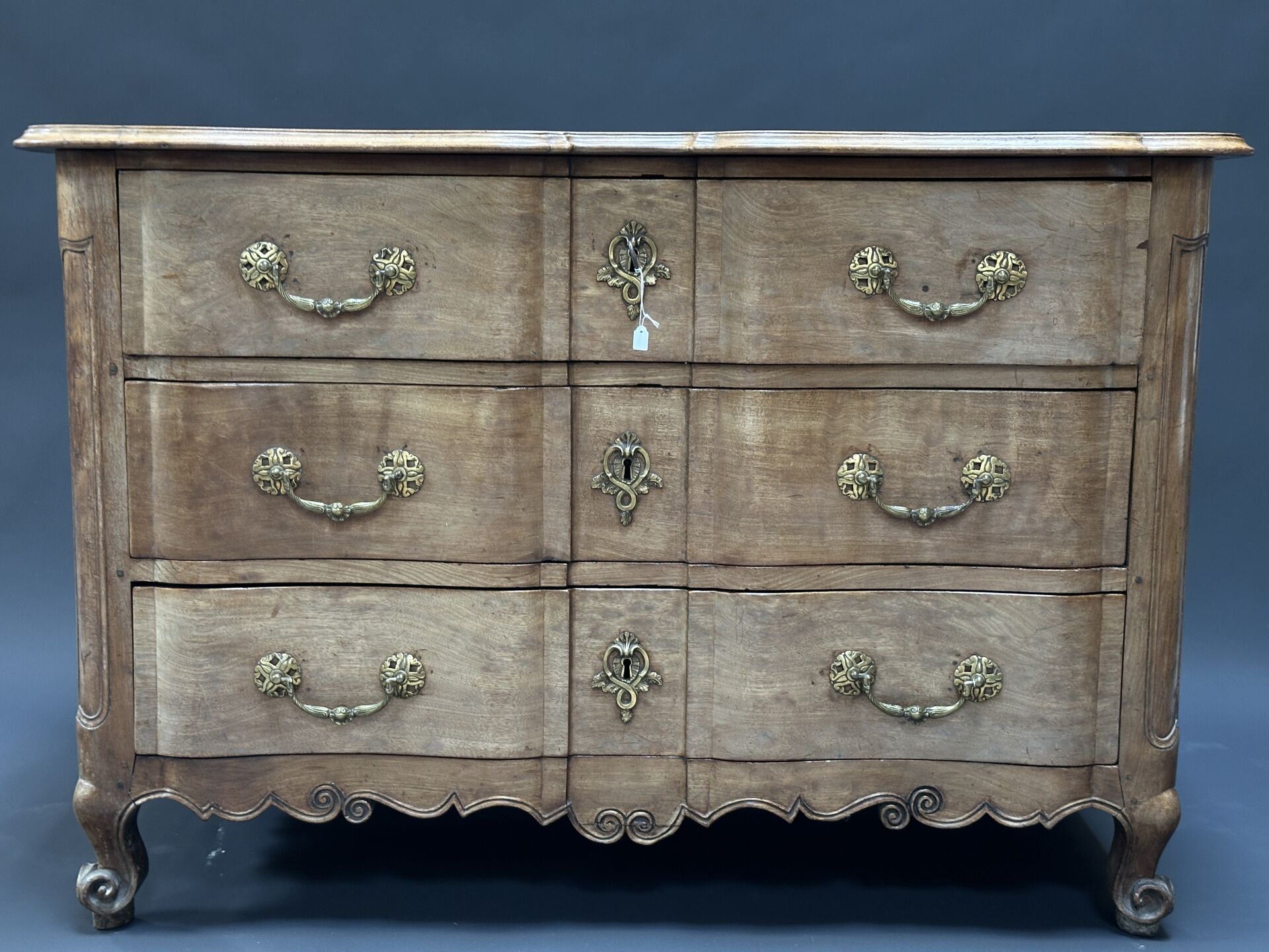 Commode arbalète en bois fruitier mouluré de filets ouvrant par trois tiroirs, montants à pans...