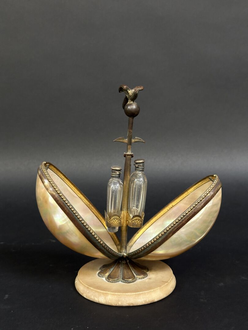 Nécessaire à odeur en nacre et monture en laiton doré surmontée d’un oiseau....