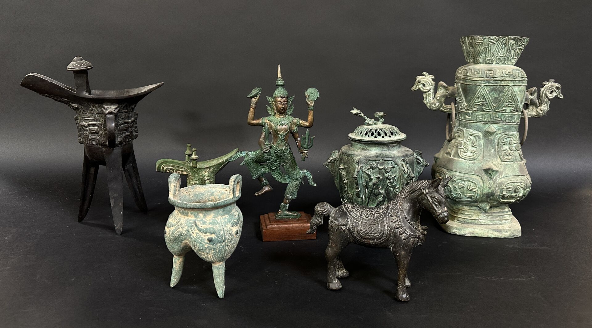Réunion de sept objets décoratifs d’Asie, en bronze ou métal dans le style archaïque...