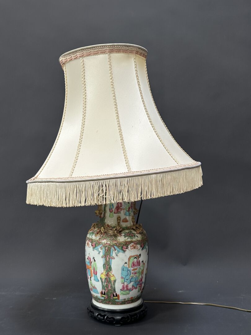 Vase en porcelaine de Canton, balustre, à décor de scènes animées de personnages dans des...