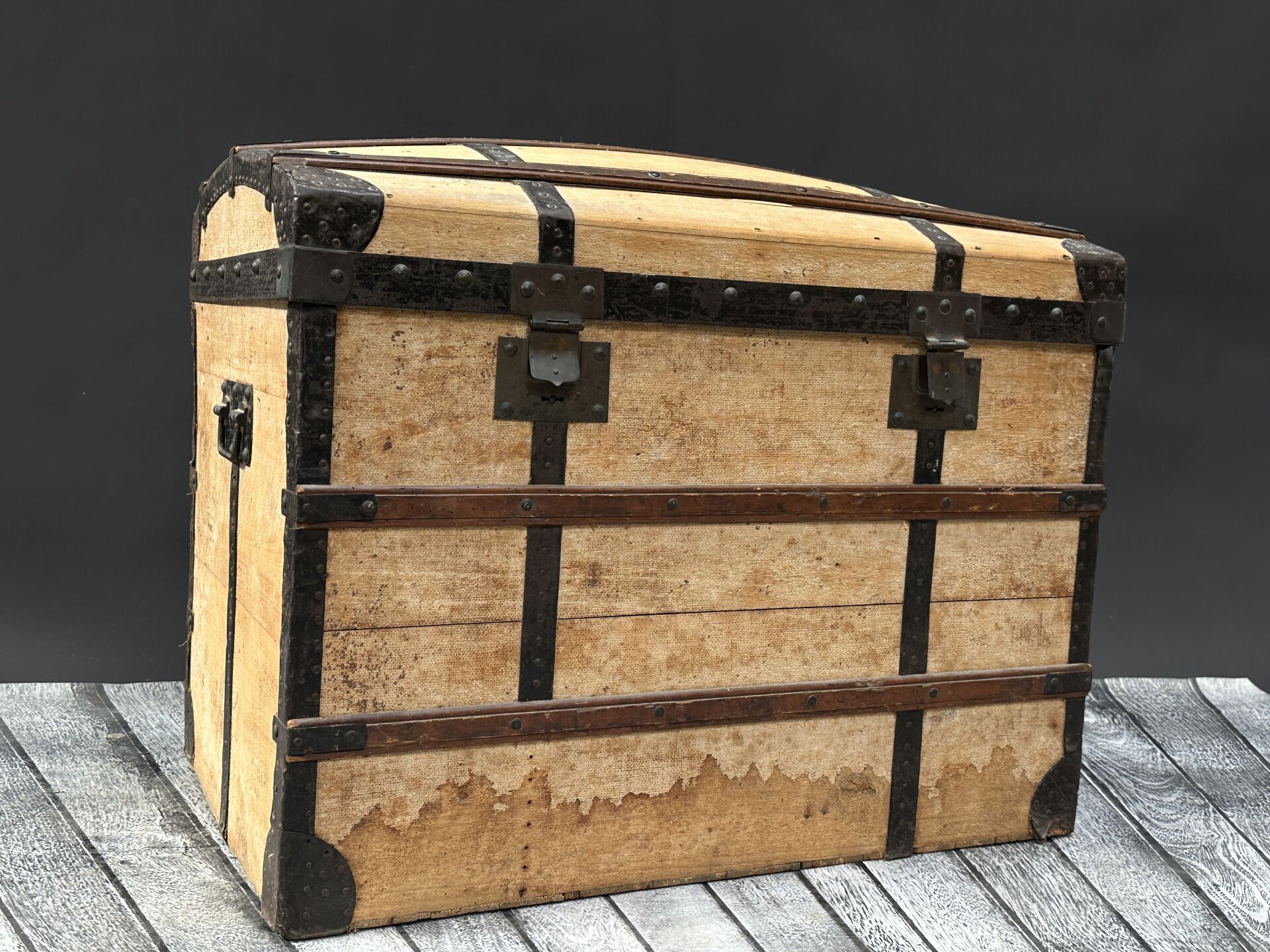 Malle en bois naturel clair et métal, ouvrant par un couvercle bombé, deux poignées...