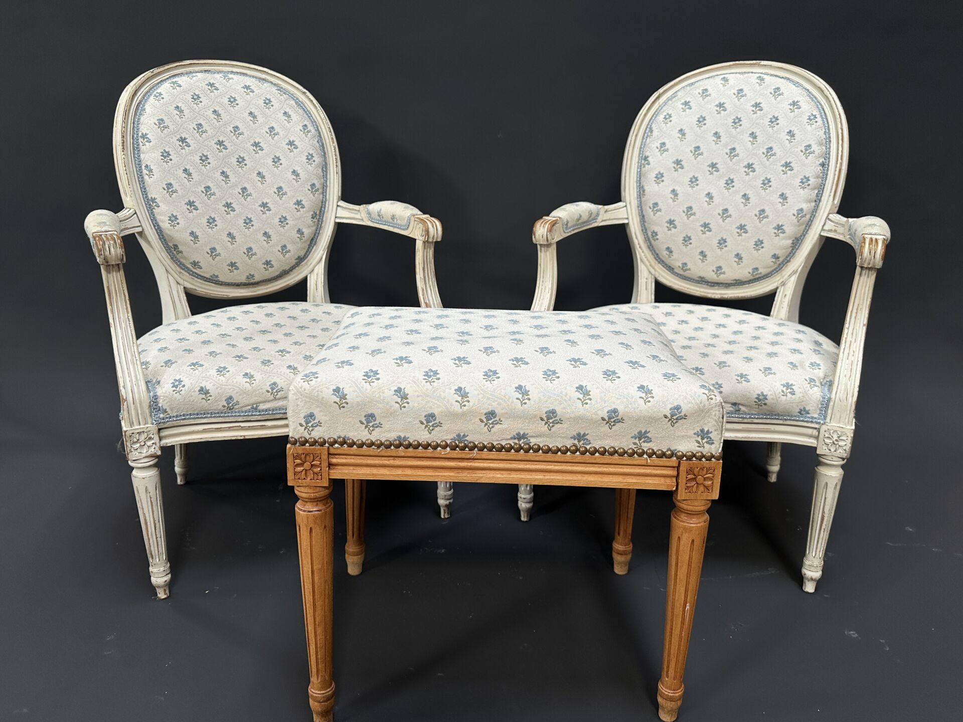 Suite de trois fauteuils en bois à dossier médaillon, les pieds fuselés, cannelés, rudentés....