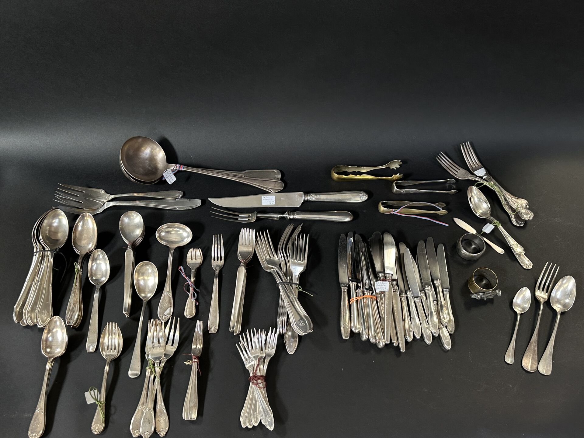 Réunion de couverts en métal et métal argenté comprenant couverts, pinces à sucre, ronds de...