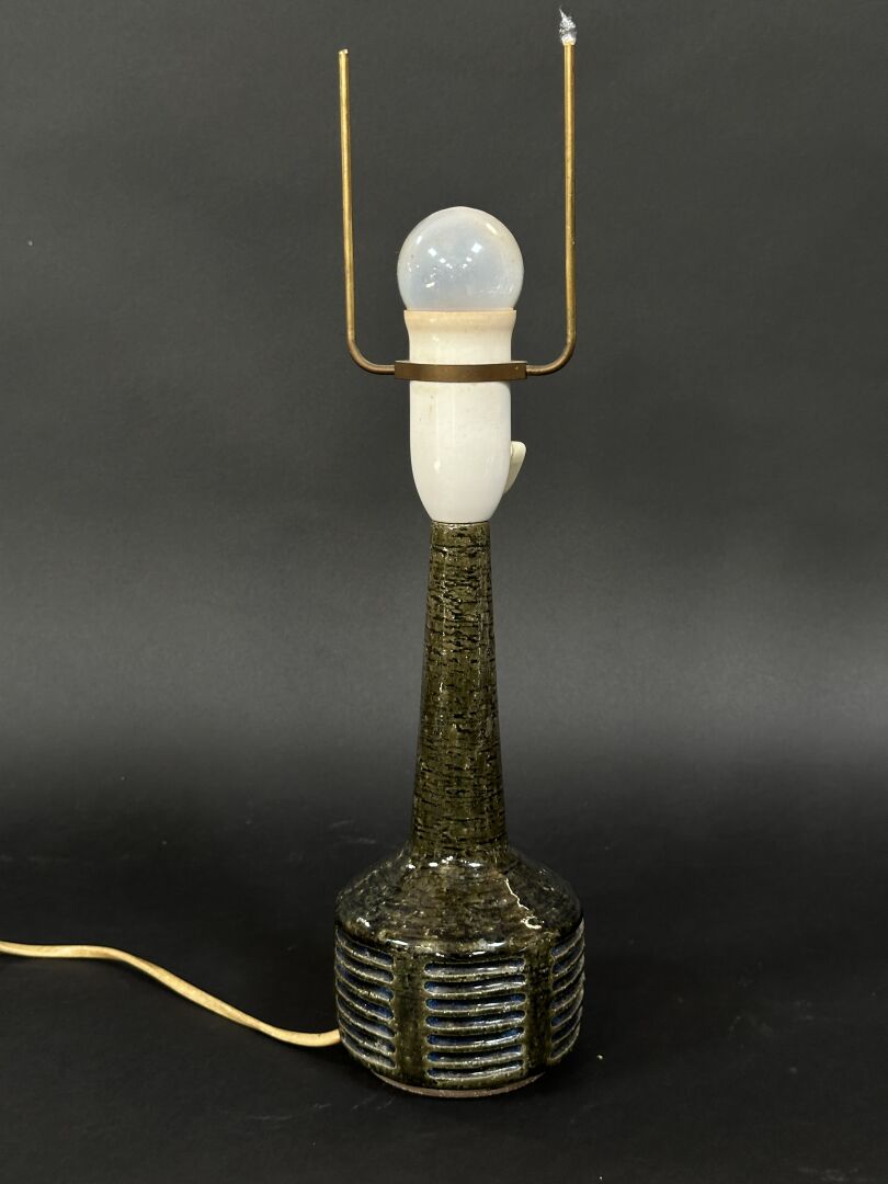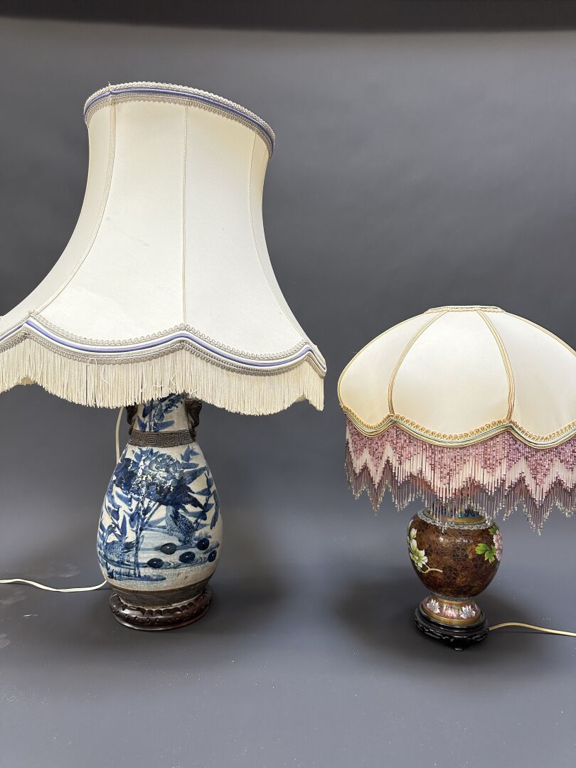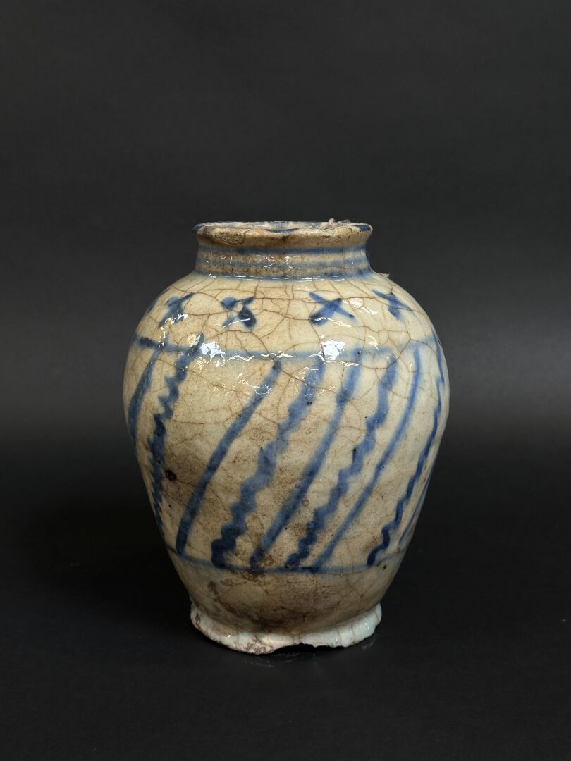 Vase à panse ovoïde en céramique à décor bleu de motifs géométriques (accidents, monté en...