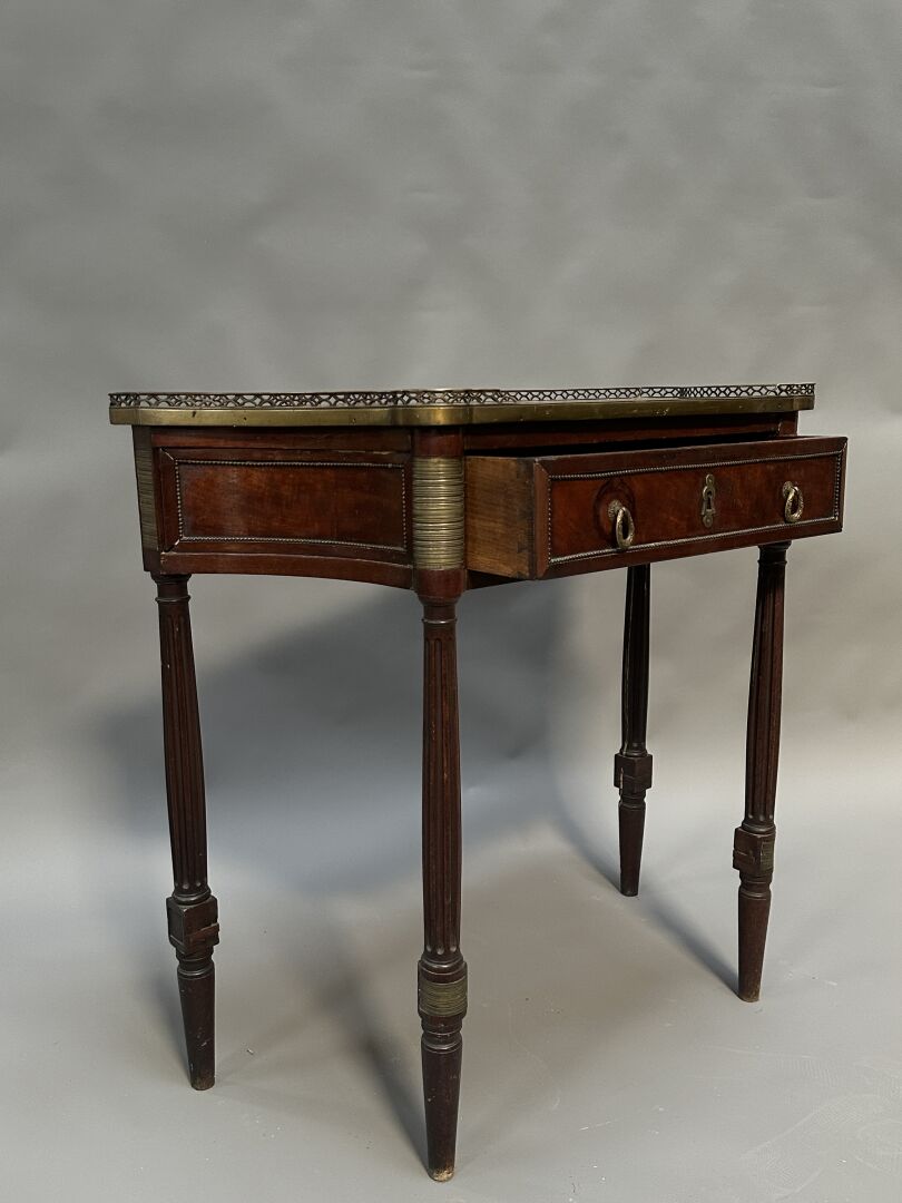 Console-desserte en bois vernis, plateau aux côtés concaves, ouvrant par un tiroir en ceinture....