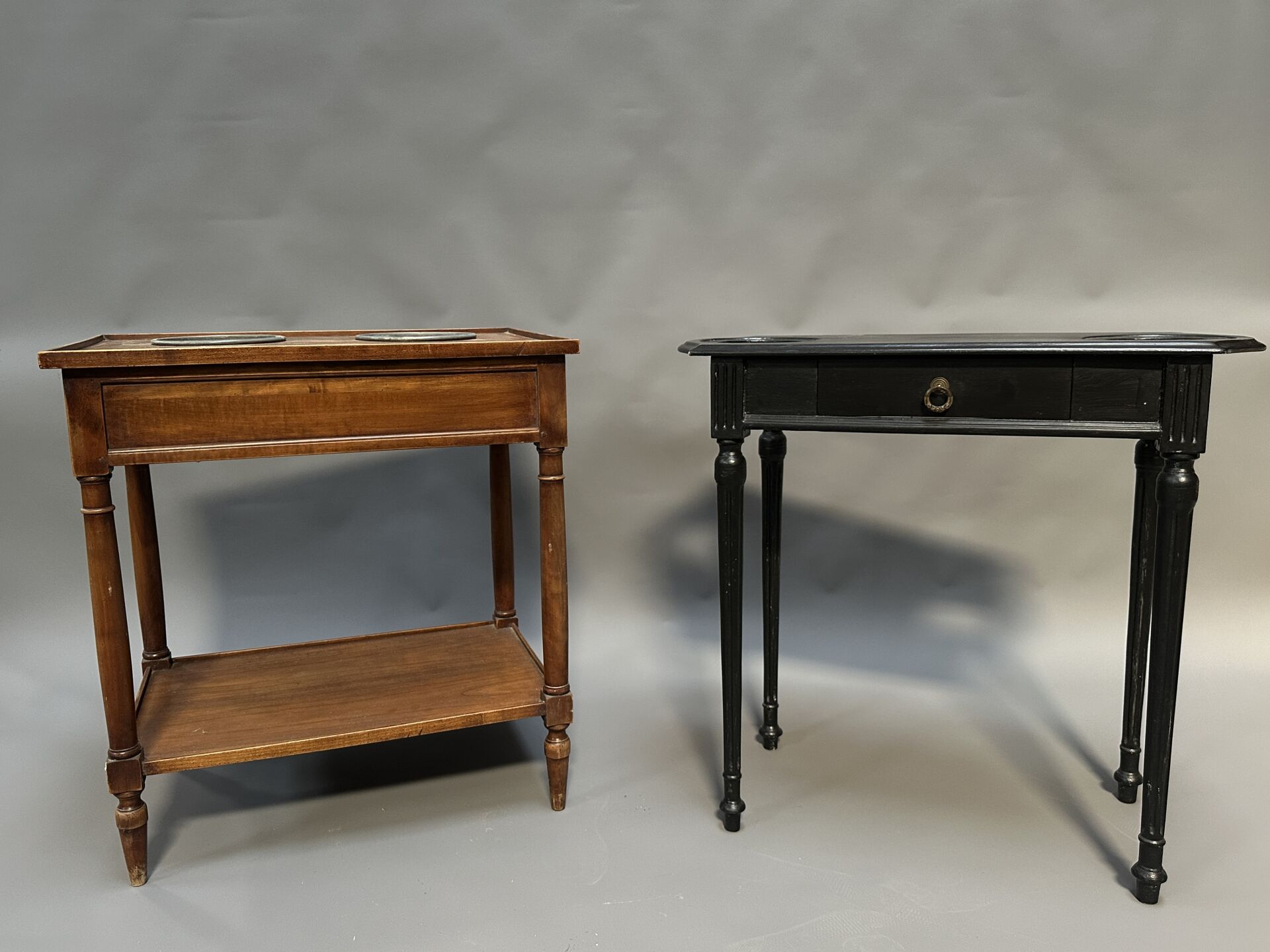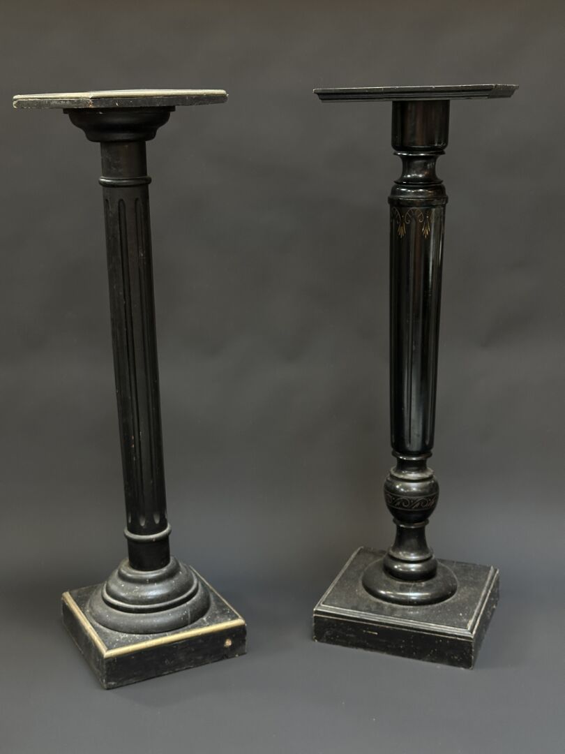 Réunion de deux sellettes en bois laqué noir, le fut à cannelures, base carrée (manques). Adjugé à : €